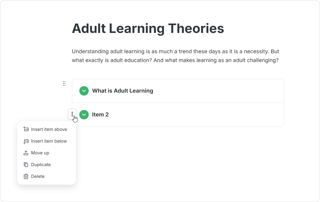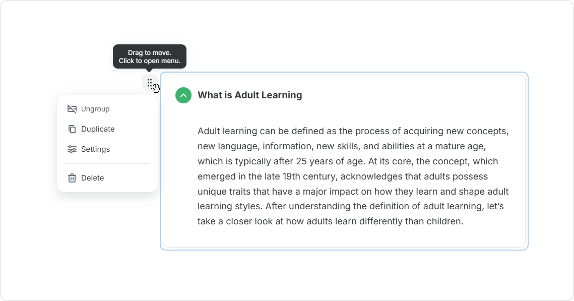 The Accordion also offers options for ungrouping, duplicating, or deleting content. To do this, follow these steps: