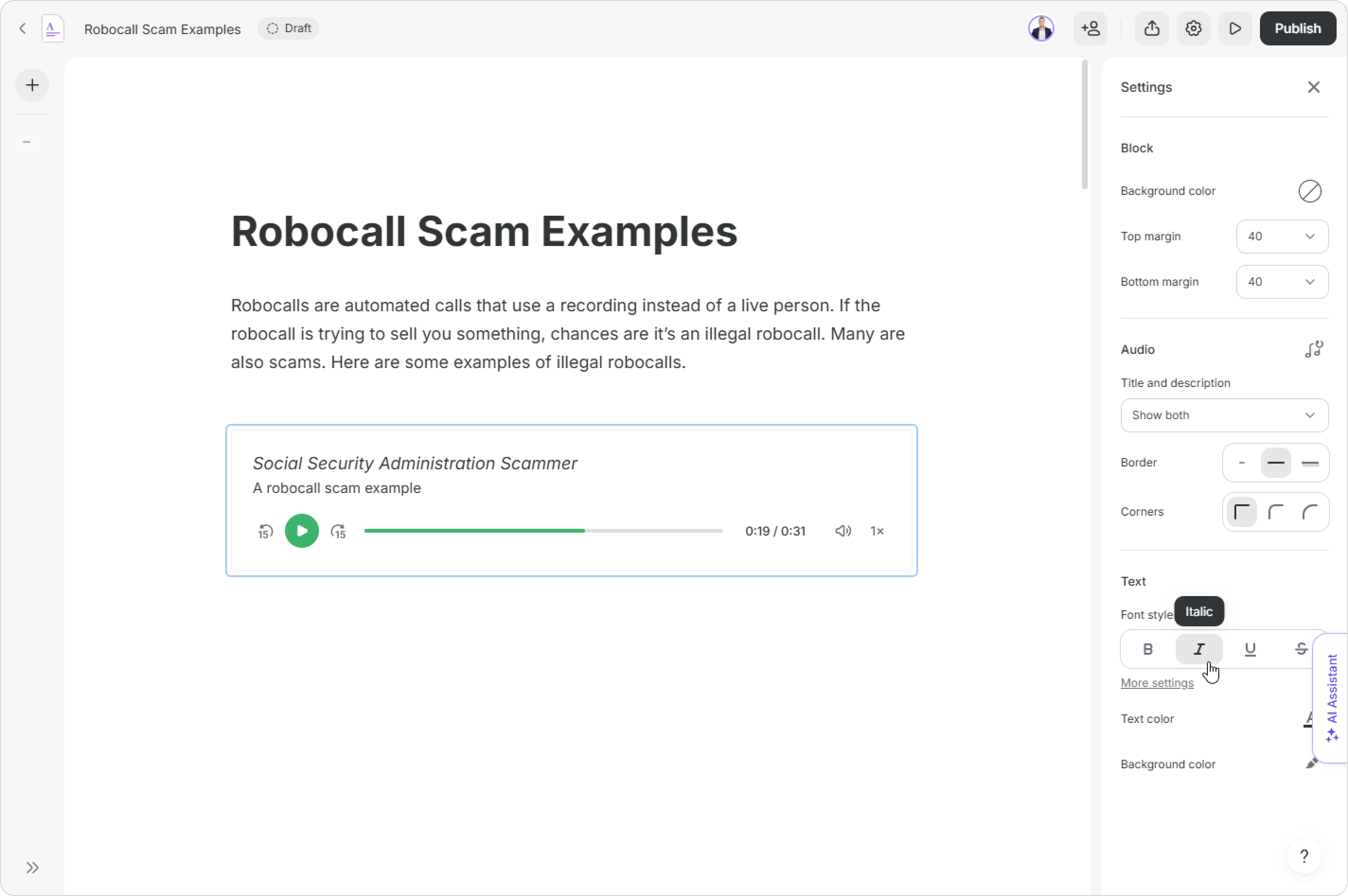 Well done! You've customized the audio block.