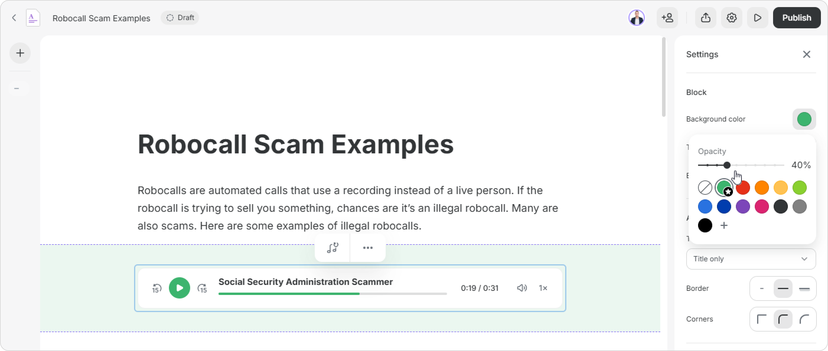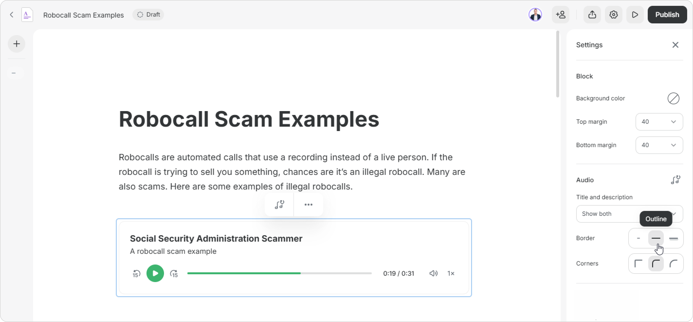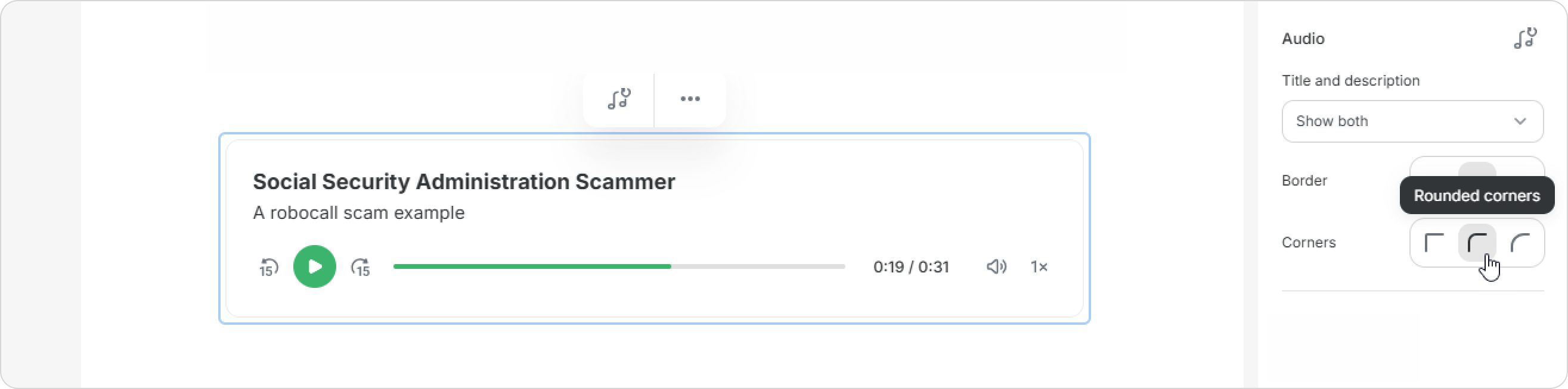 Your audio block can have sharp or rounded corners, a thin outline, or a shadow — all of these can help you create a balanced design.