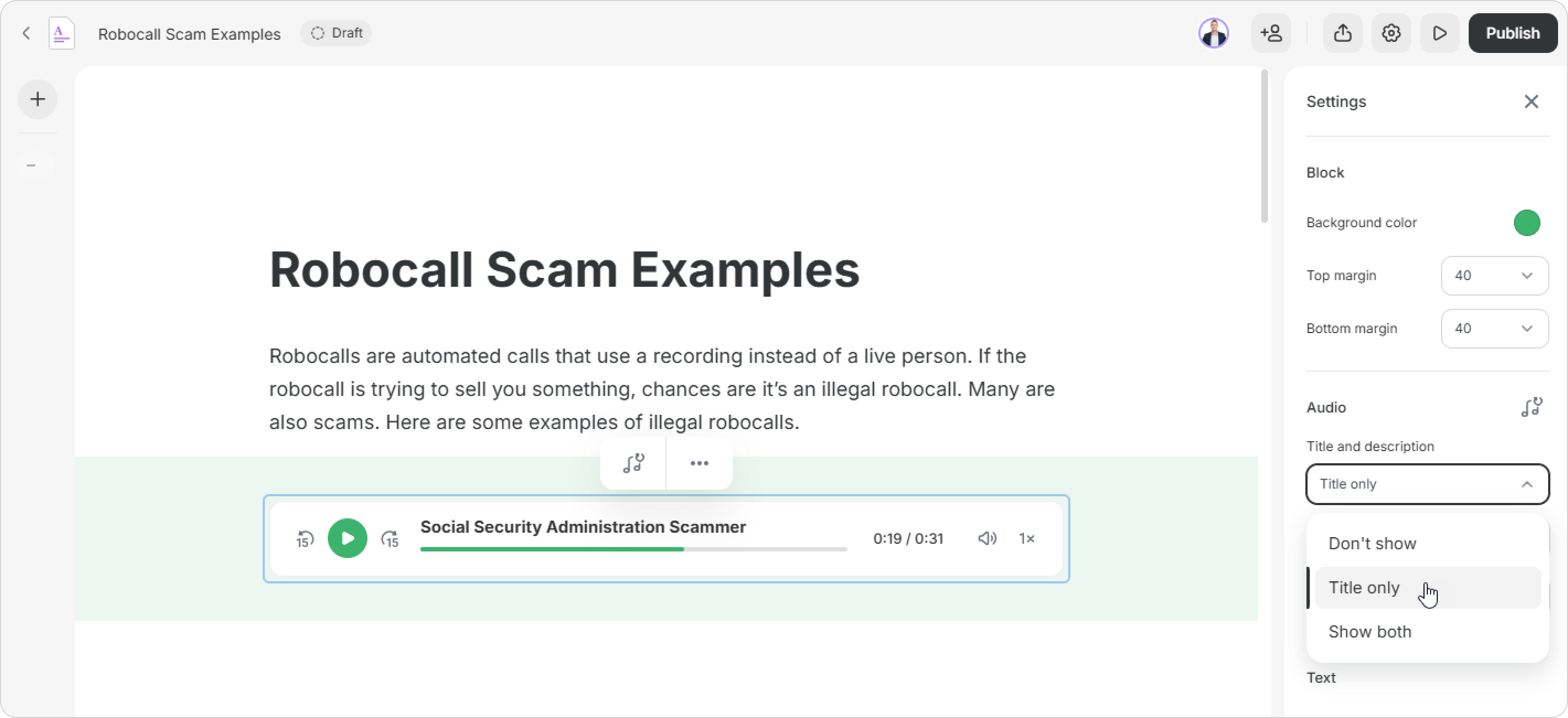 Adjust the block to match the style of the page. For example, you can hide the audio's title and description, change the player's outline, apply shadow effects, etc.