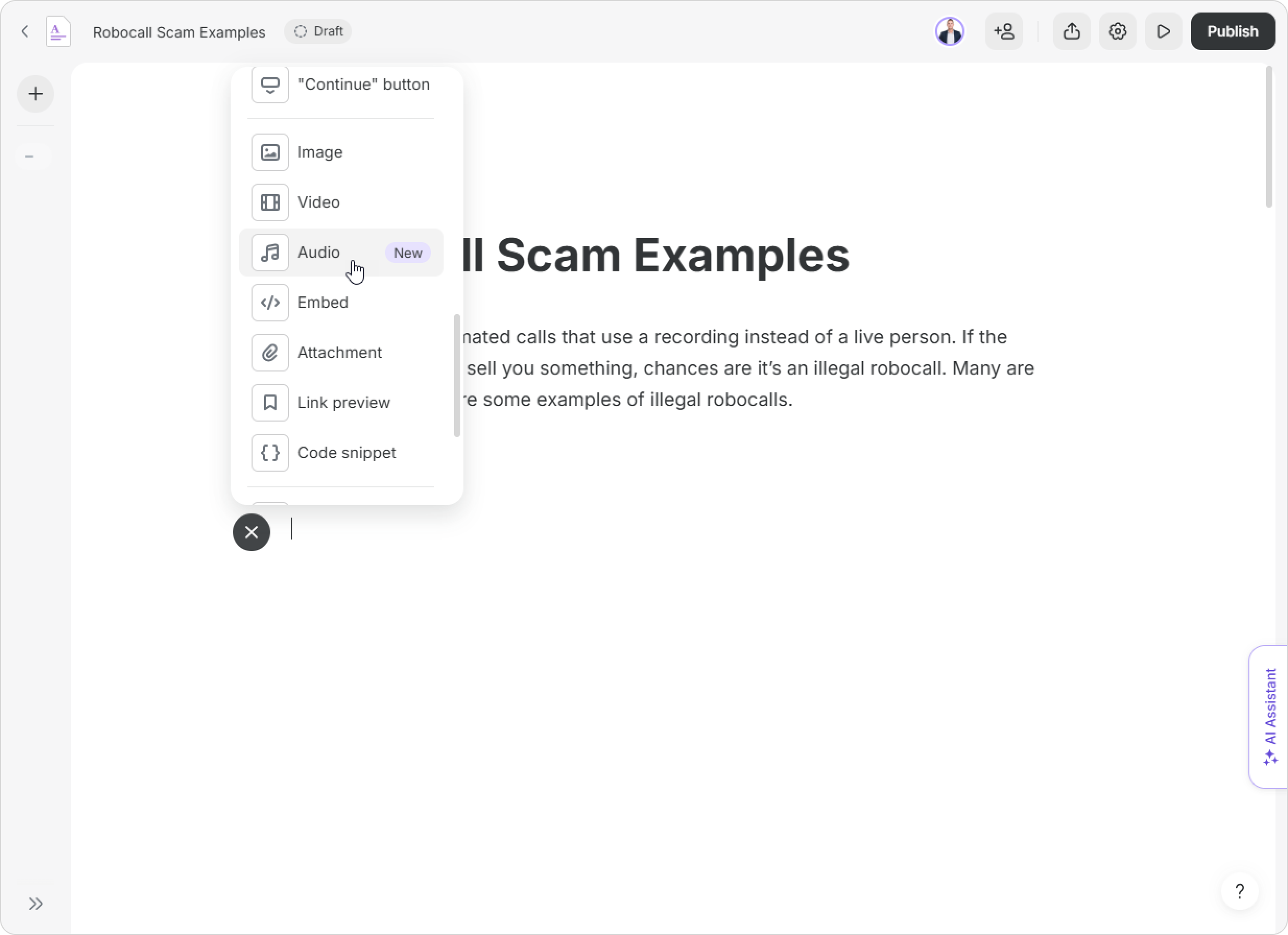 You can add audio clips (up to 250 MB) to pages seamlessly. These can be recordings, podcasts, music, or other audio formats that make courses more dynamic and engaging. Learners can listen to audio directly on the page and manage playback speed and volume and jump to specific moments in the audio.