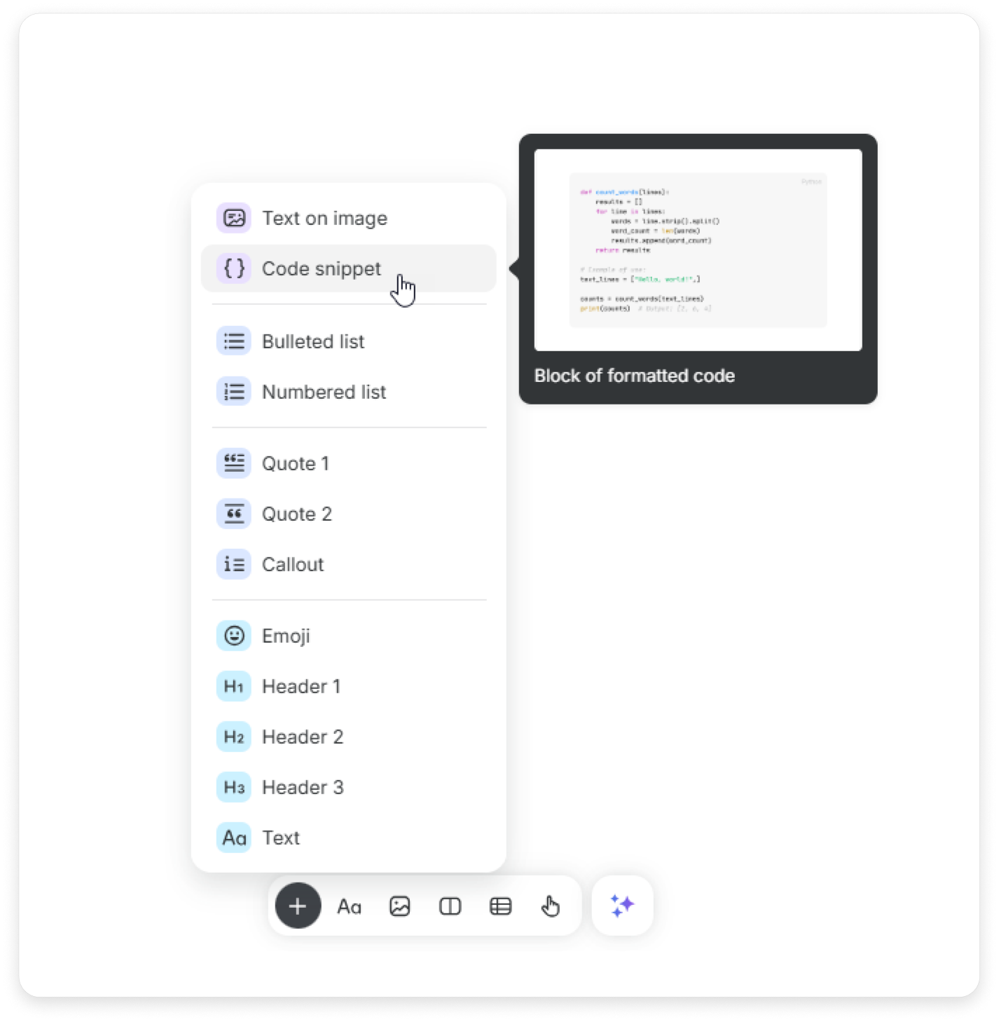 Open a page. In the toolbar, navigate to Text and select Code snippet.