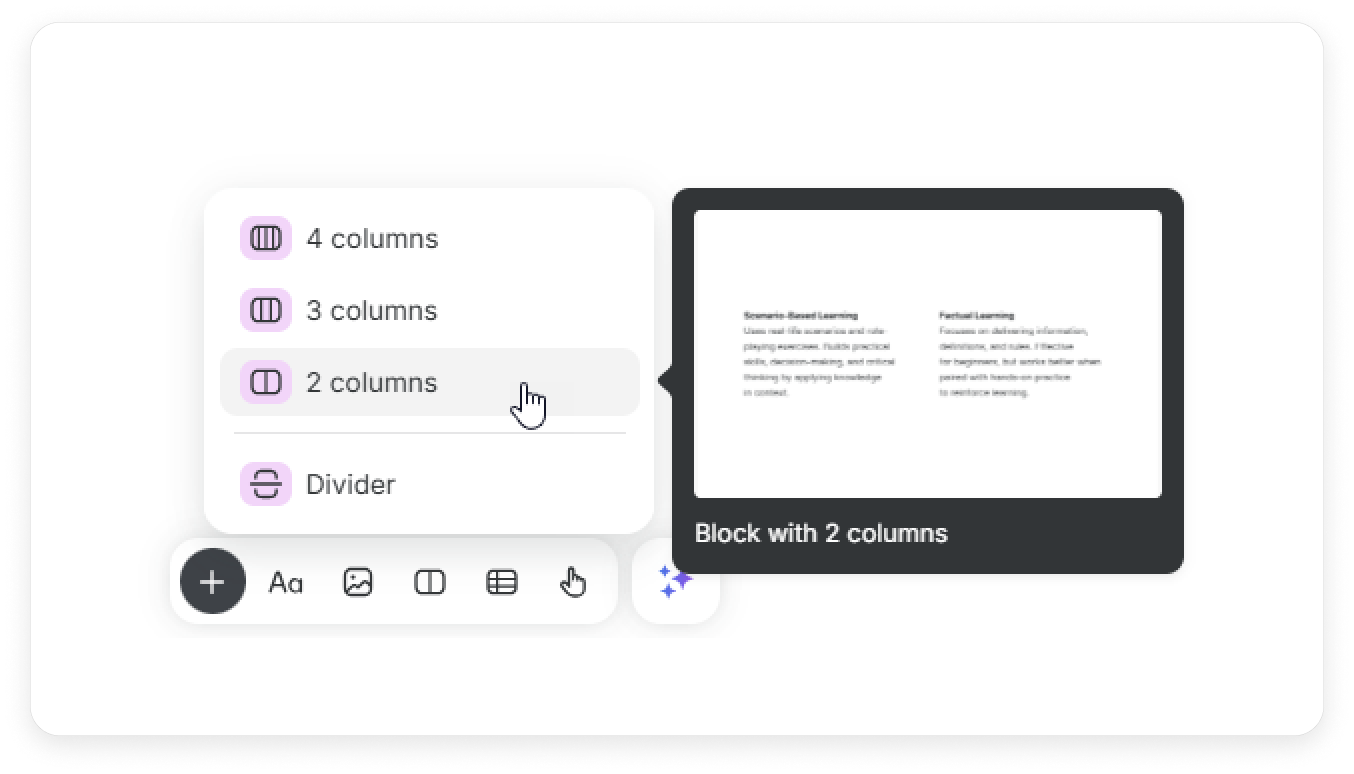 - In the toolbar, navigate to Columns and dividers and choose how many columns you want to add: 2, 3, or 4.