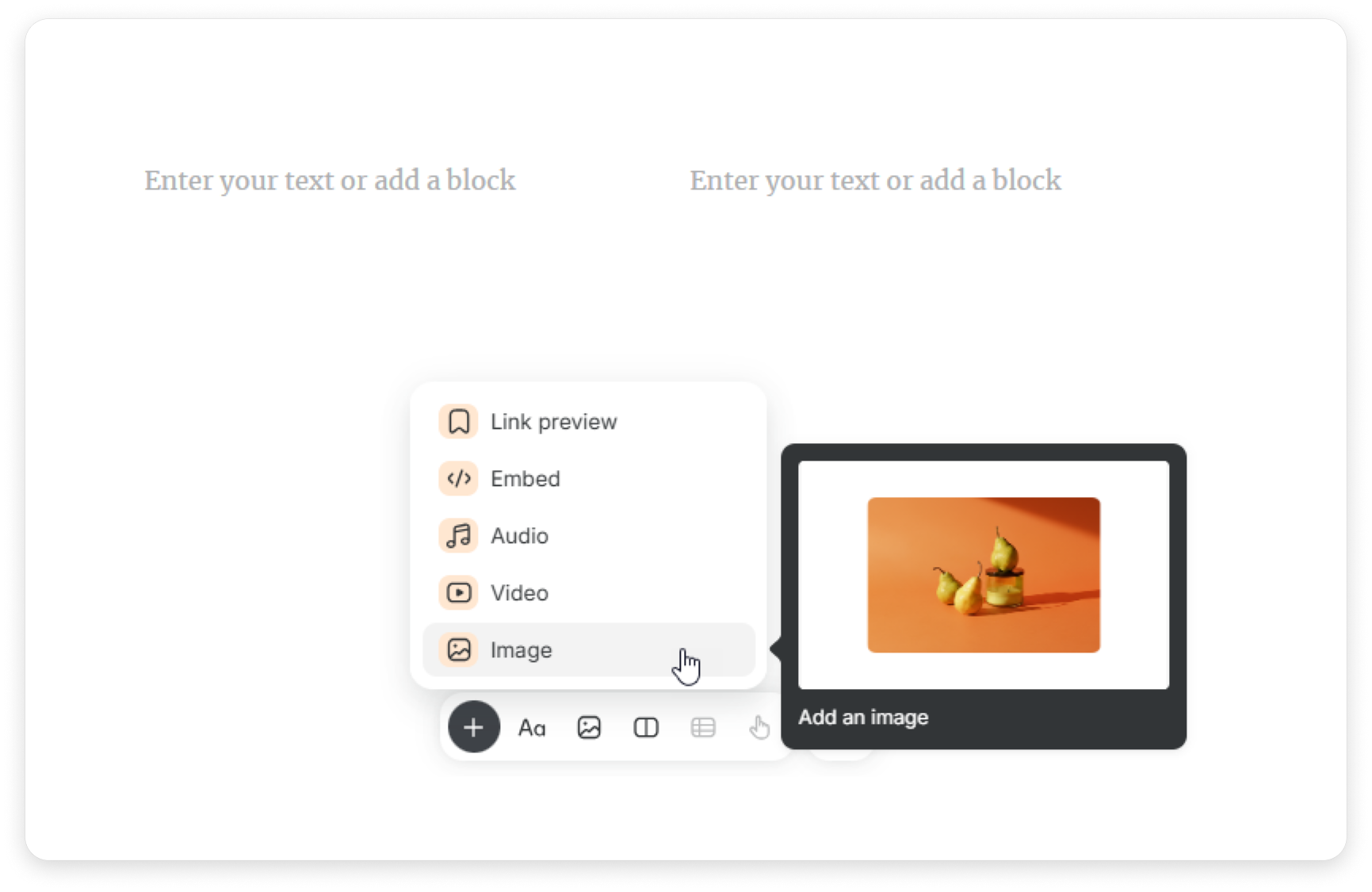 Column is a layout that allows for the arrangement of different elements, such as: text, headers, lists, callouts, quotes, dividers, images, videos, embeds, link previews. They can be arranged in 2–4 columns.