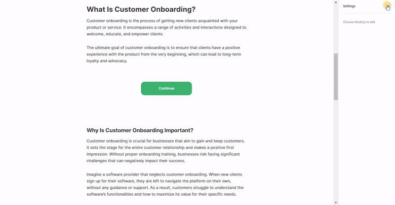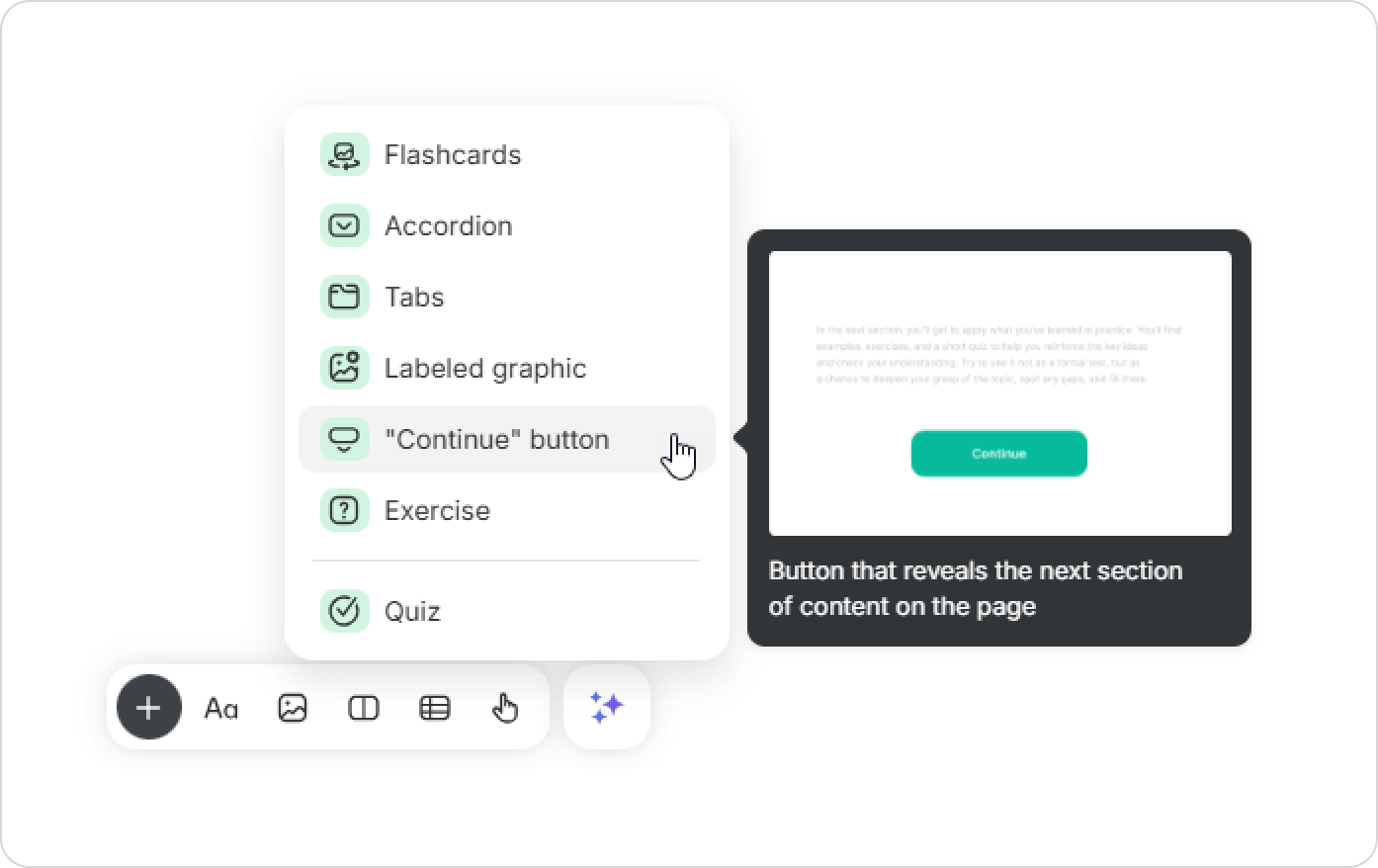 The addition of the "Continue" button essentially divides information into "chunks," allowing readers to pause while reading to better absorb information. The text that comes after the button will be hidden until the reader clicks on it. Learners will be able to pause and process the information before moving on. This way, learning becomes even more interactive!