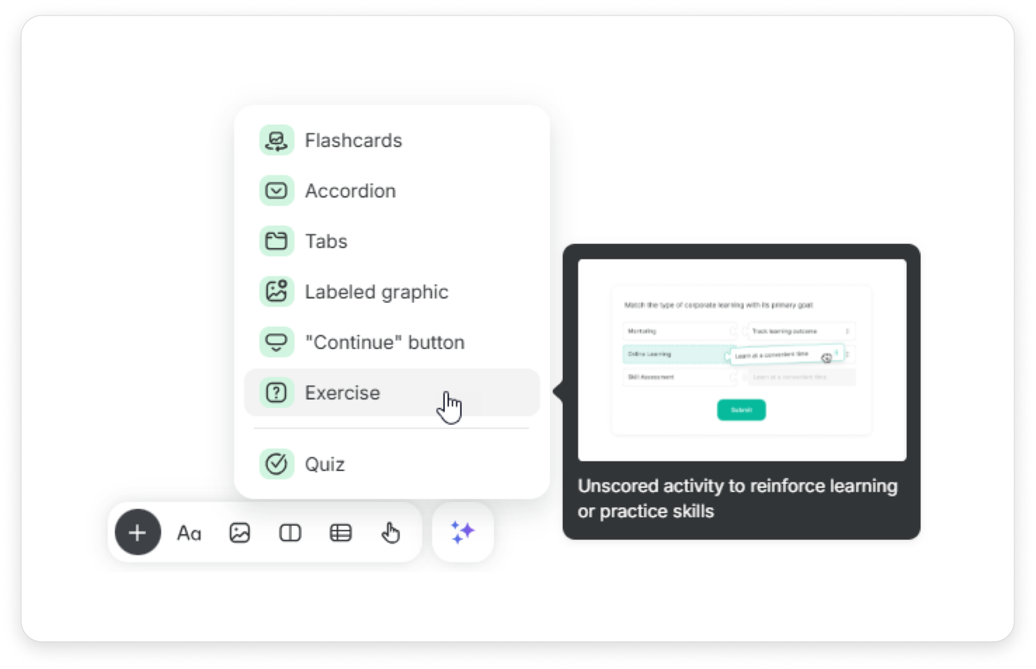 Check how learners are gaining new knowledge while reading through a page. To do this, add and exercise — one or multiple questions that are embedded in the chapter. Learners will answer questions, receive feedback, and figure out whether they fully understood and memorized the read-through page.