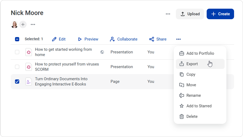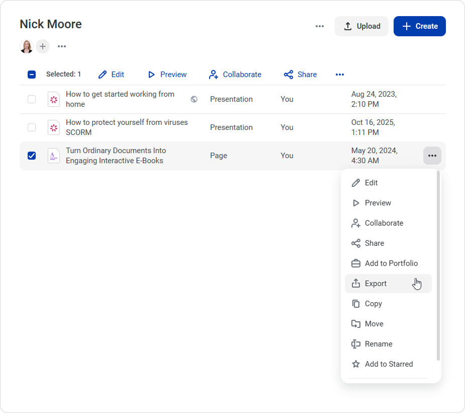 The third way to export a content item is to click on the menu to the right of the content and choose Export.