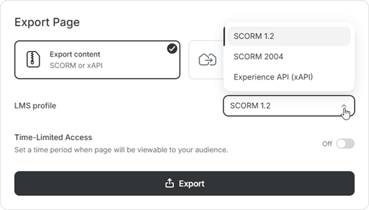 Export content — Export the page or quiz in the SCORM 1.2, SCORM 2004, or Experience API (xAPI) format.