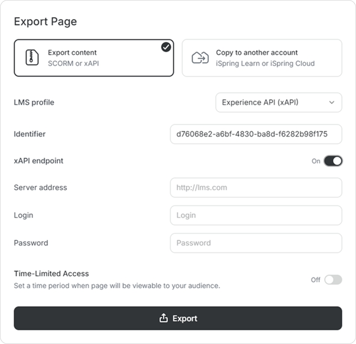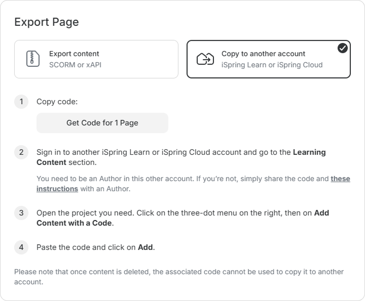 Copy to another account — Transfer the page to another iSpring LMS or iSpring Cloud account using a generated code. Learn more about exporting to another account.