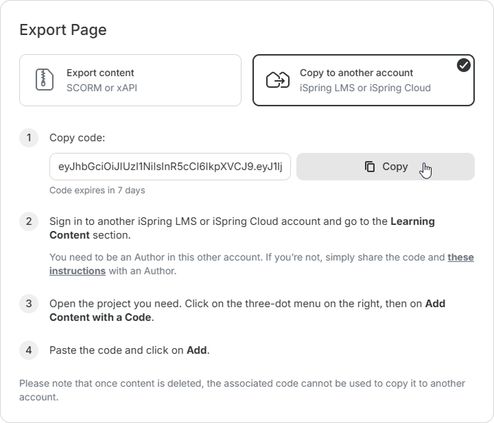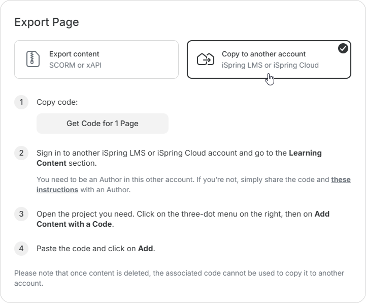 You can transfer pages to another iSpring Cloud or iSpring LMS accounts using a generated code. Easily share a separate copy of the page with all formatting preserved.