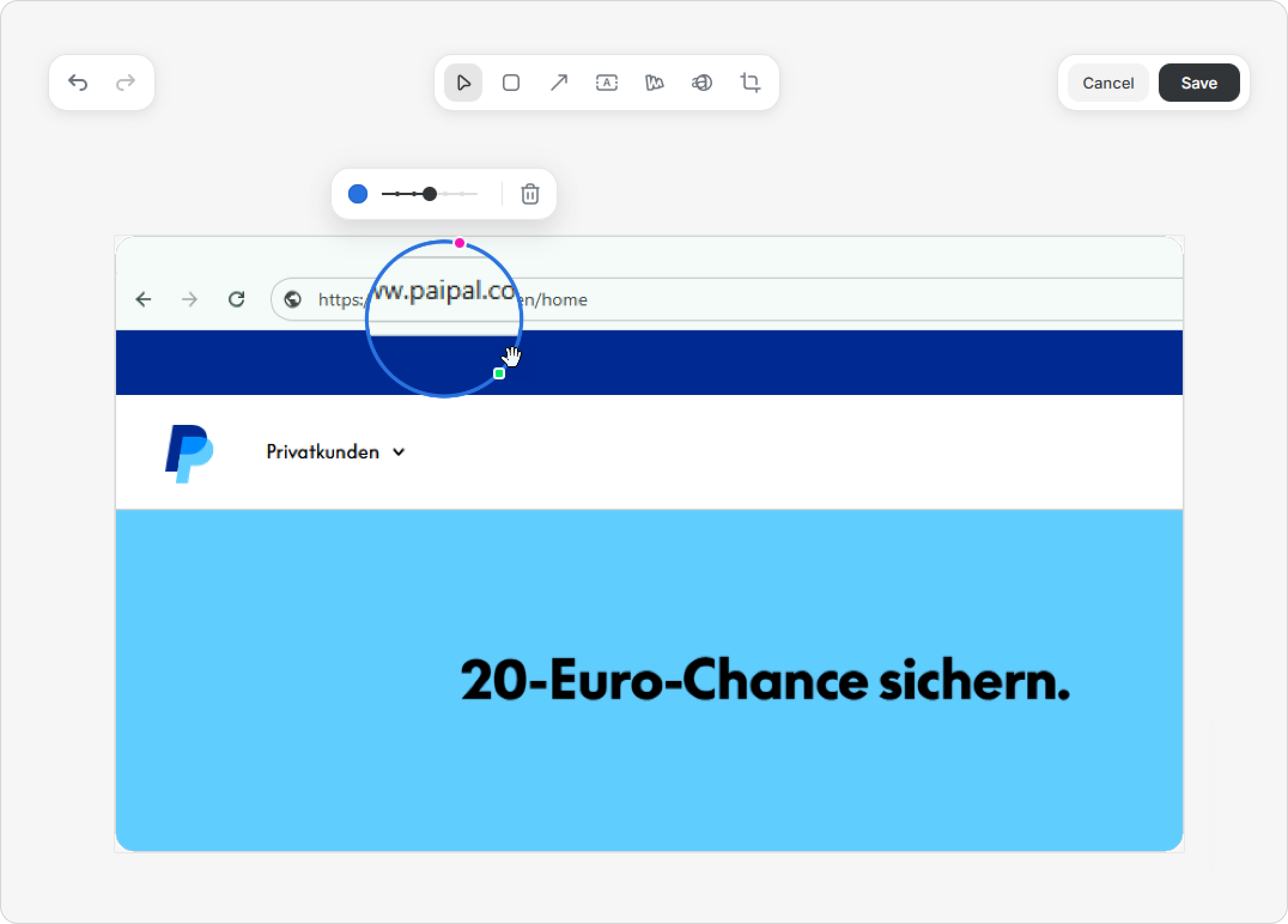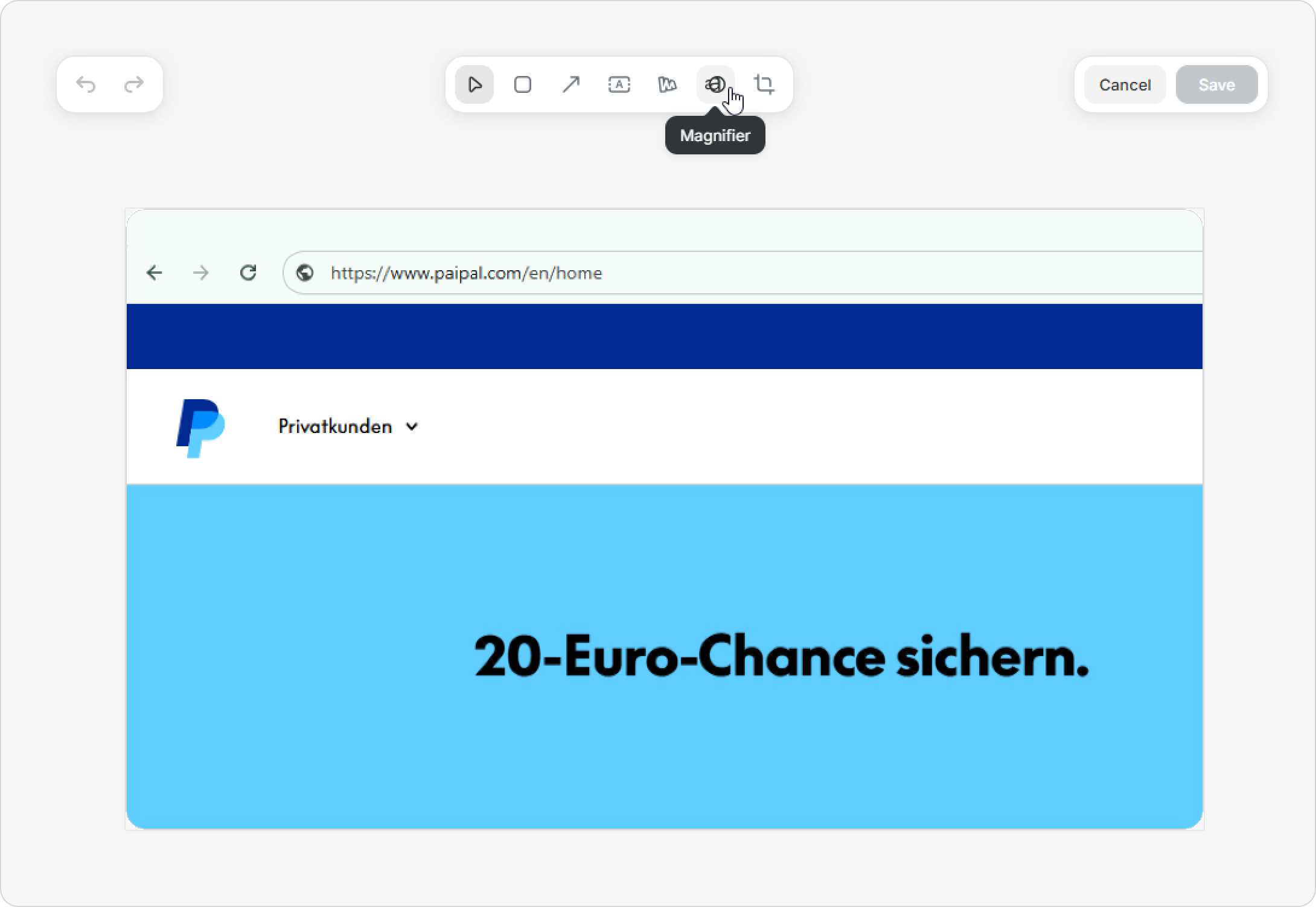 - Click Magnifier to enlarge a specific area of the screenshot. For example, let’s highlight the (very suspicious!) URL.