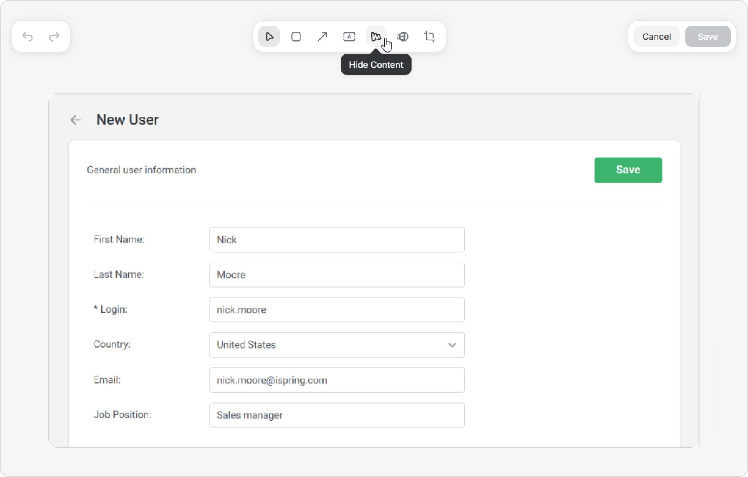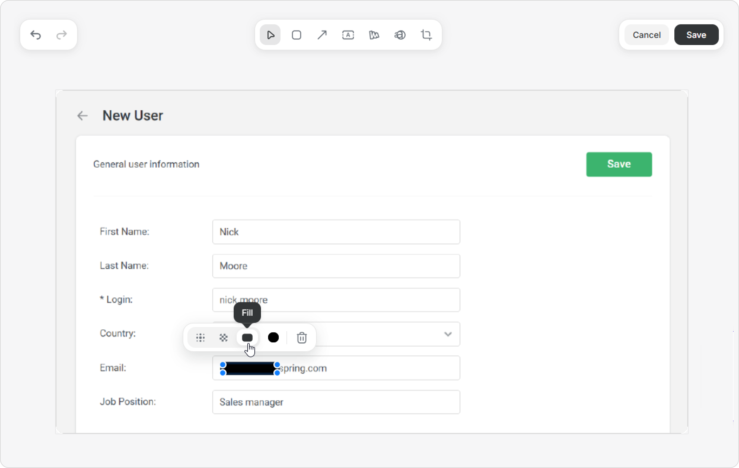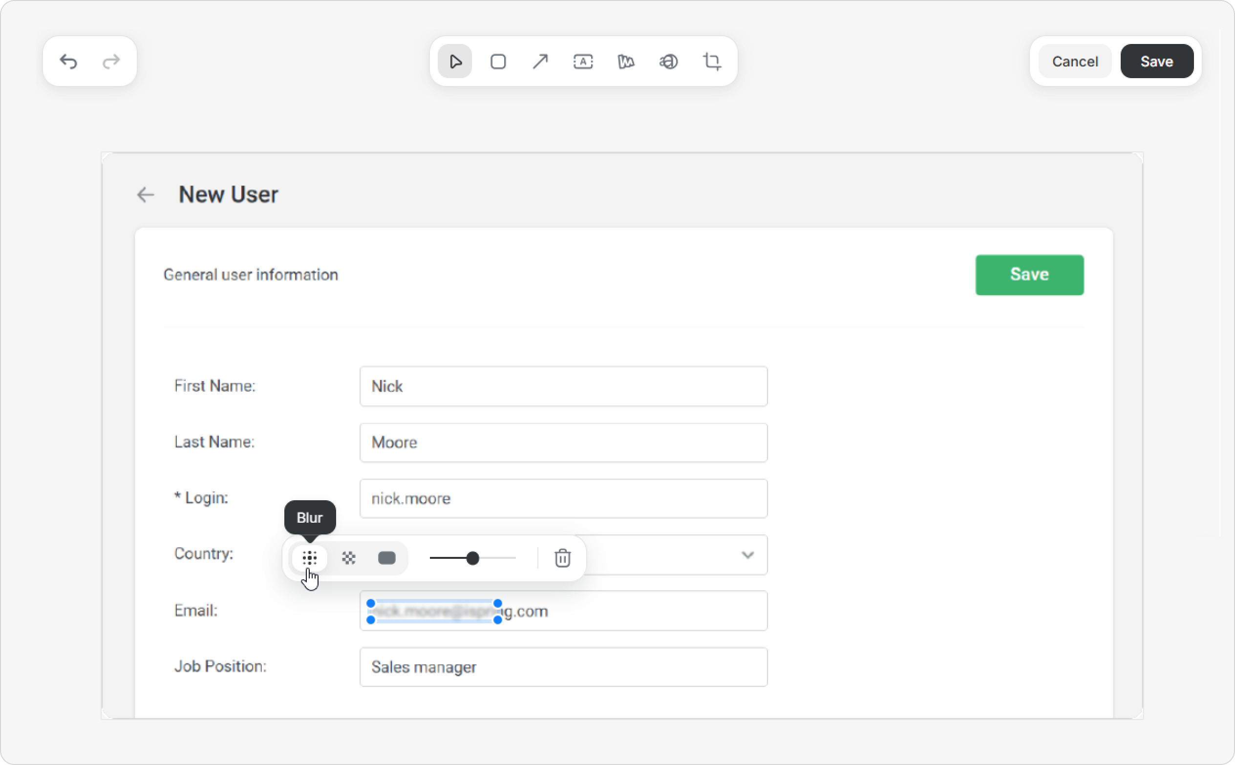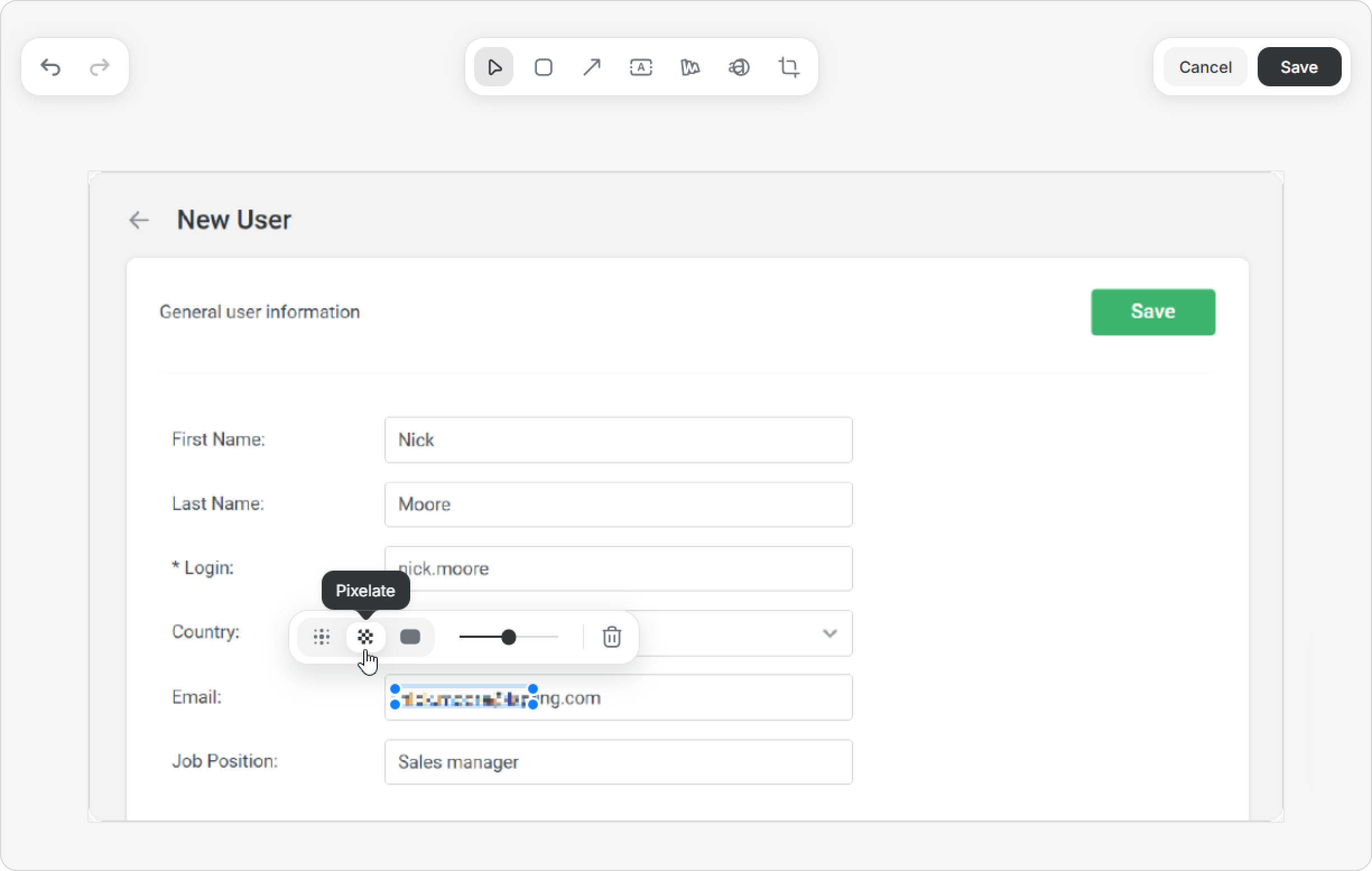 The Info-hiding tool can be used to hide login details, photos, emails, phone numbers, or even unwanted text so the personal stays private. You can use blur, pixelation, or fill to hide confidential information in a screenshot.