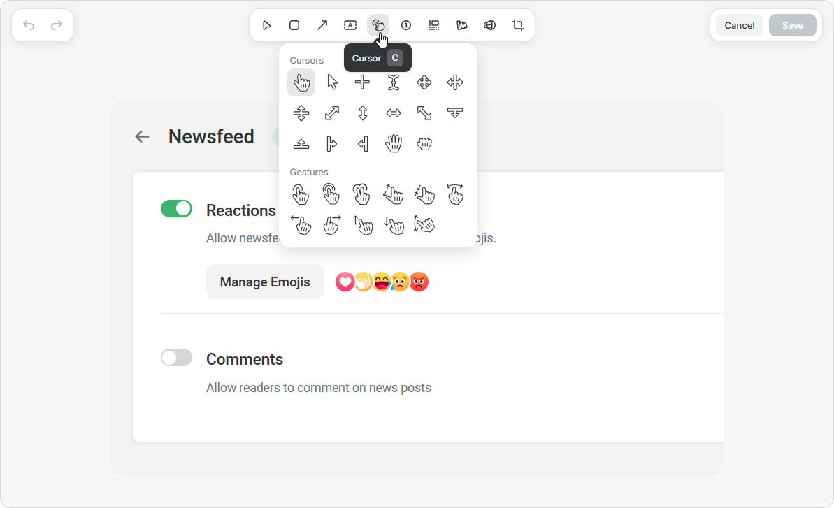 - Cursors work best for desktop apps. Use them to show mouse-based actions such as hover, drag, resize, and move.