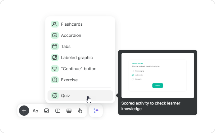 Authors can add quizzes to pages to assess learners' comprehension and retention of the content.