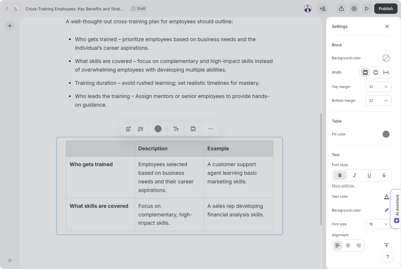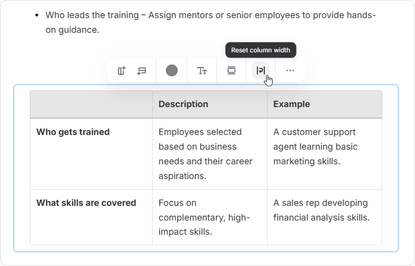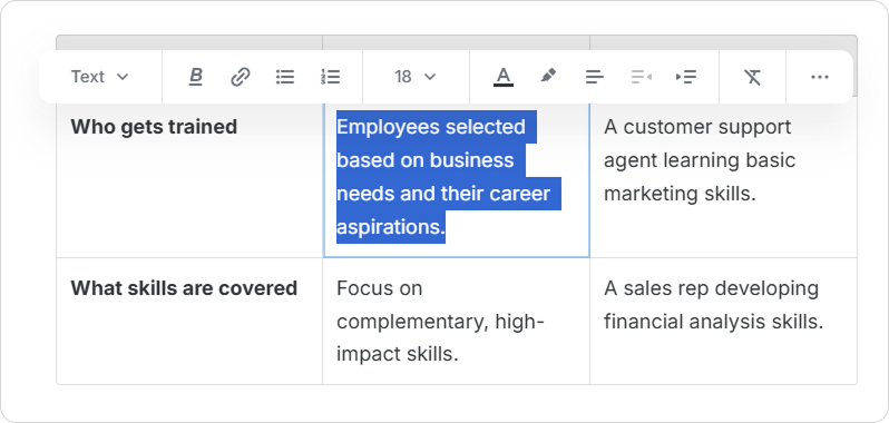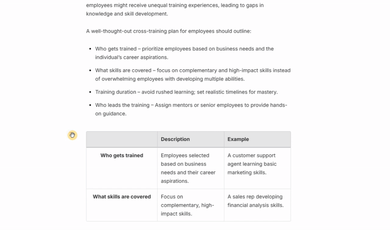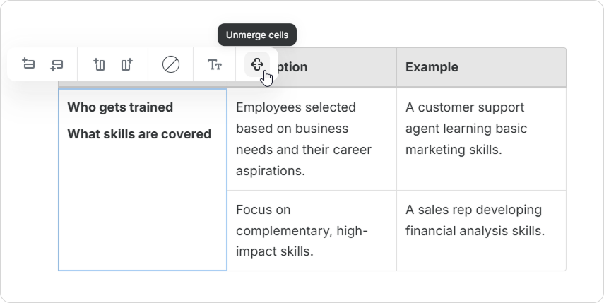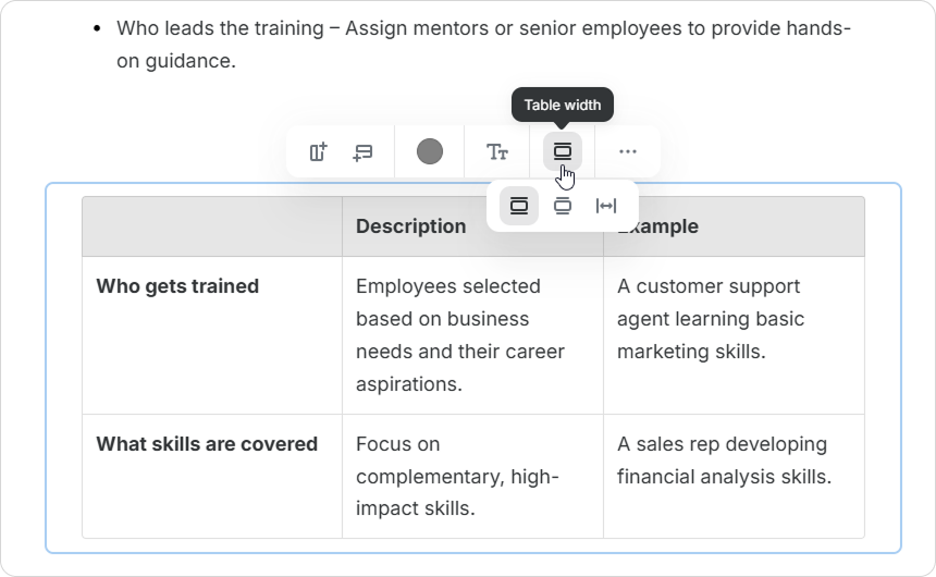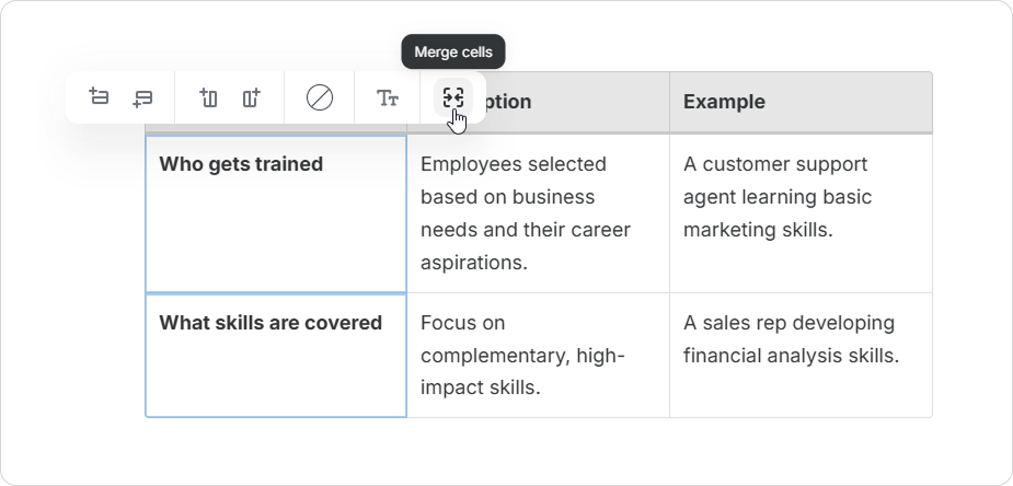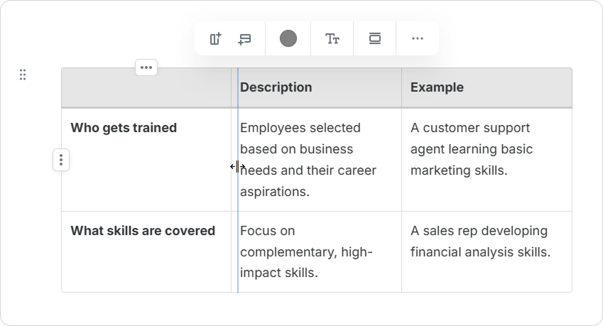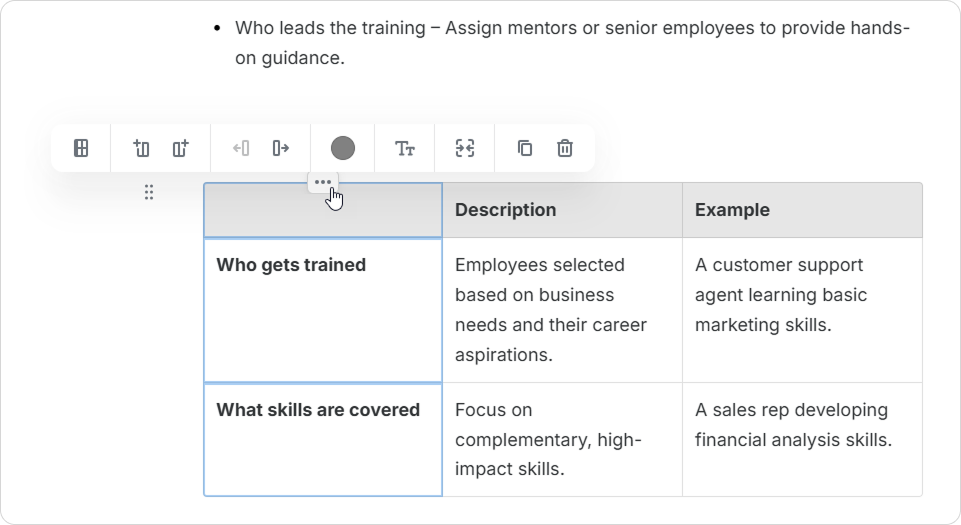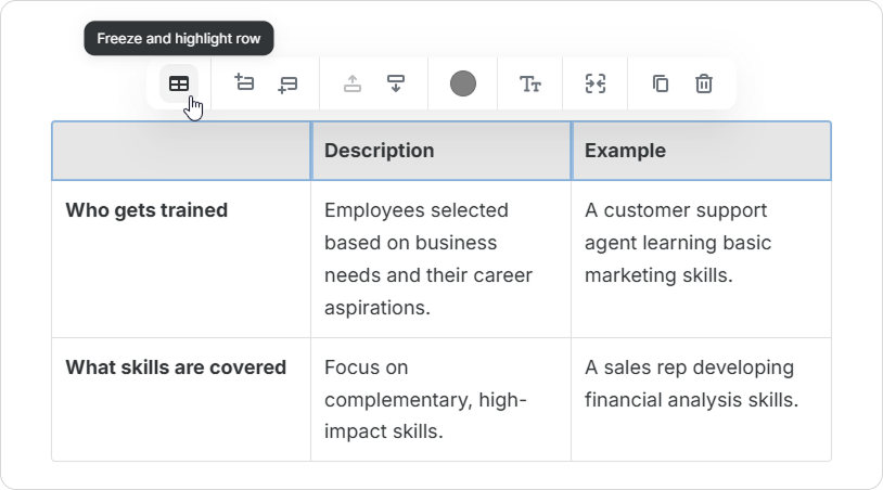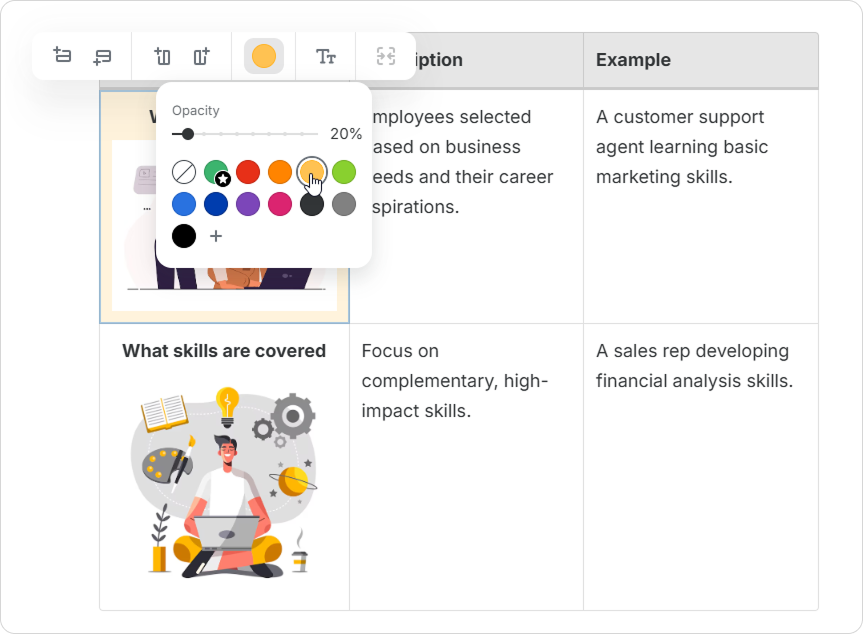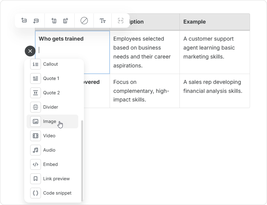 Course Authors can enrich tables with various content elements. This includes images, videos, lists, and code snippets. Upgrade your tables and make your pages more informative and engaging.