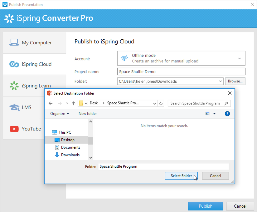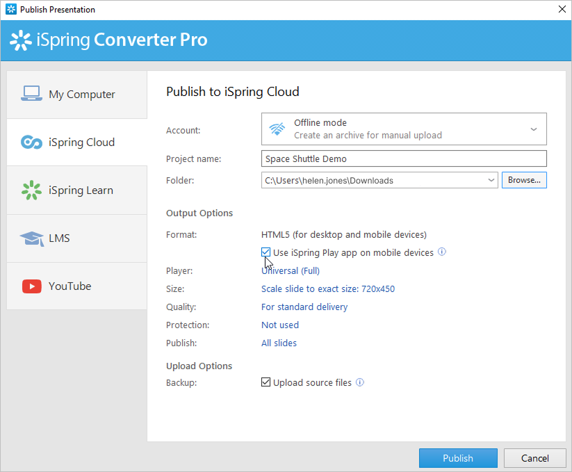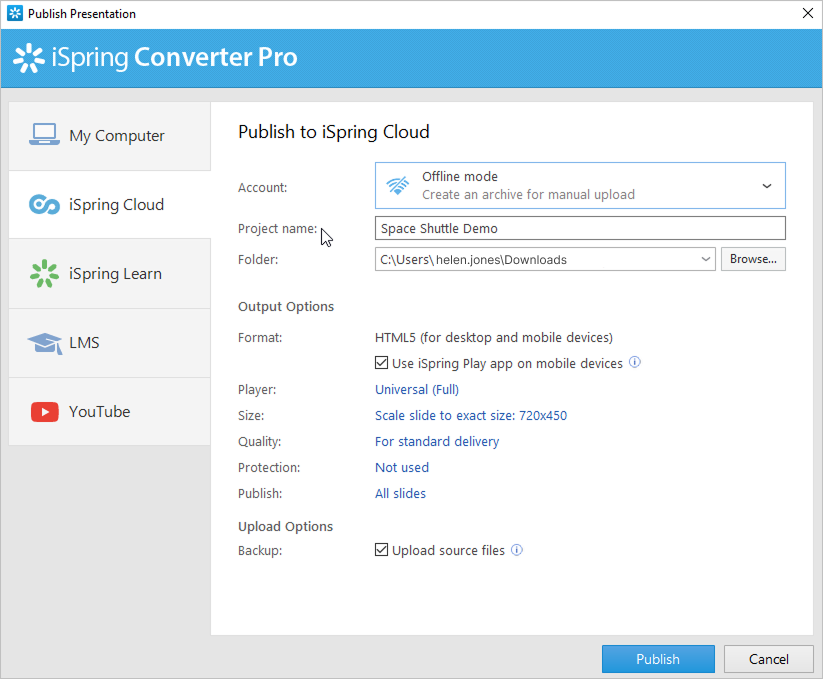 iSpring Converter Pro creates a package ready for uploading to the iSpring Cloud service. Now you can log into your iSpring Cloud account and upload this package at any convenient time. To learn more, read the detailed instructions for uploading courses to iSpring Cloud via the web interface.