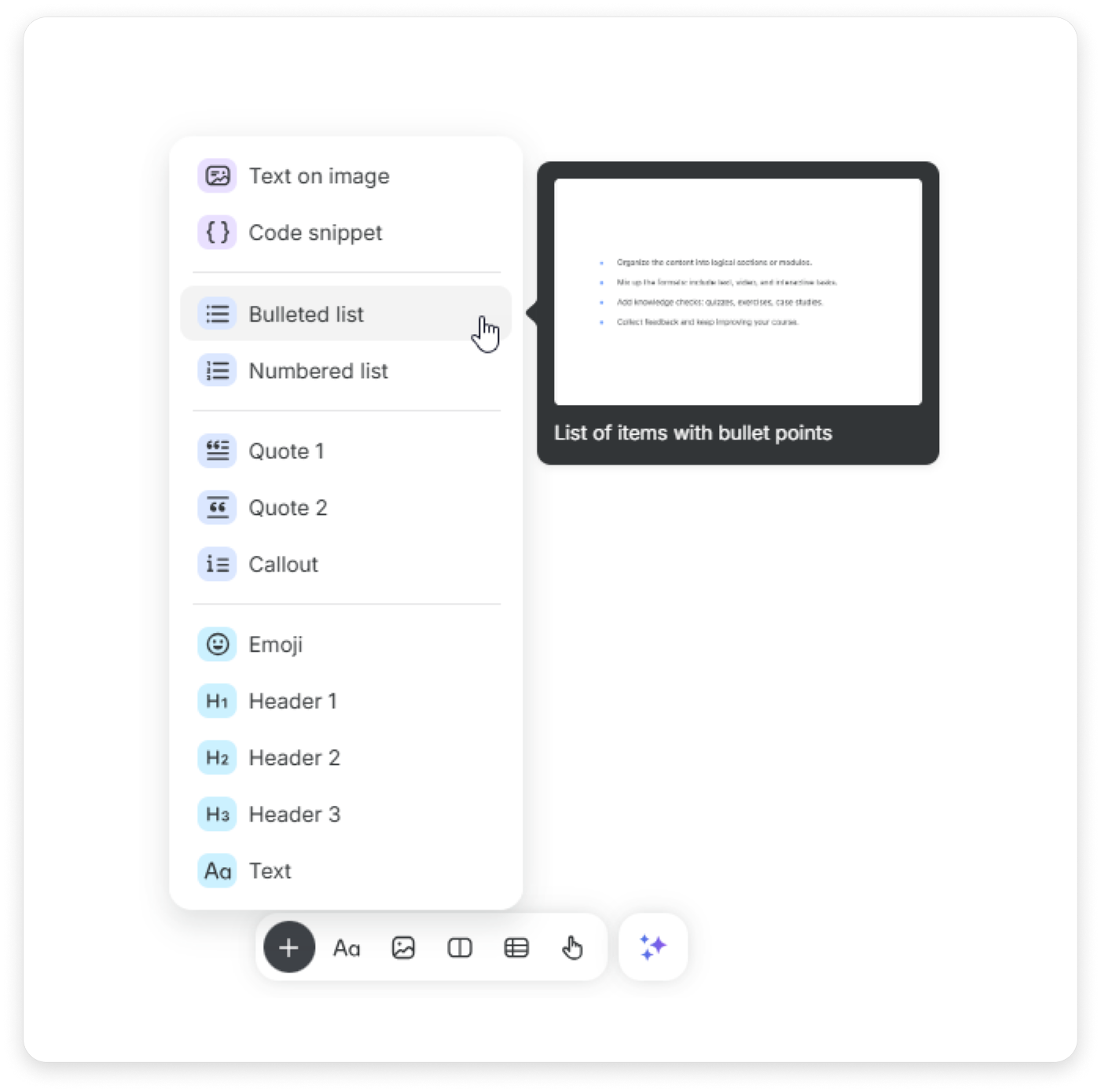 You can also replace one element with another. For example, a text can be changed to a bulleted list.