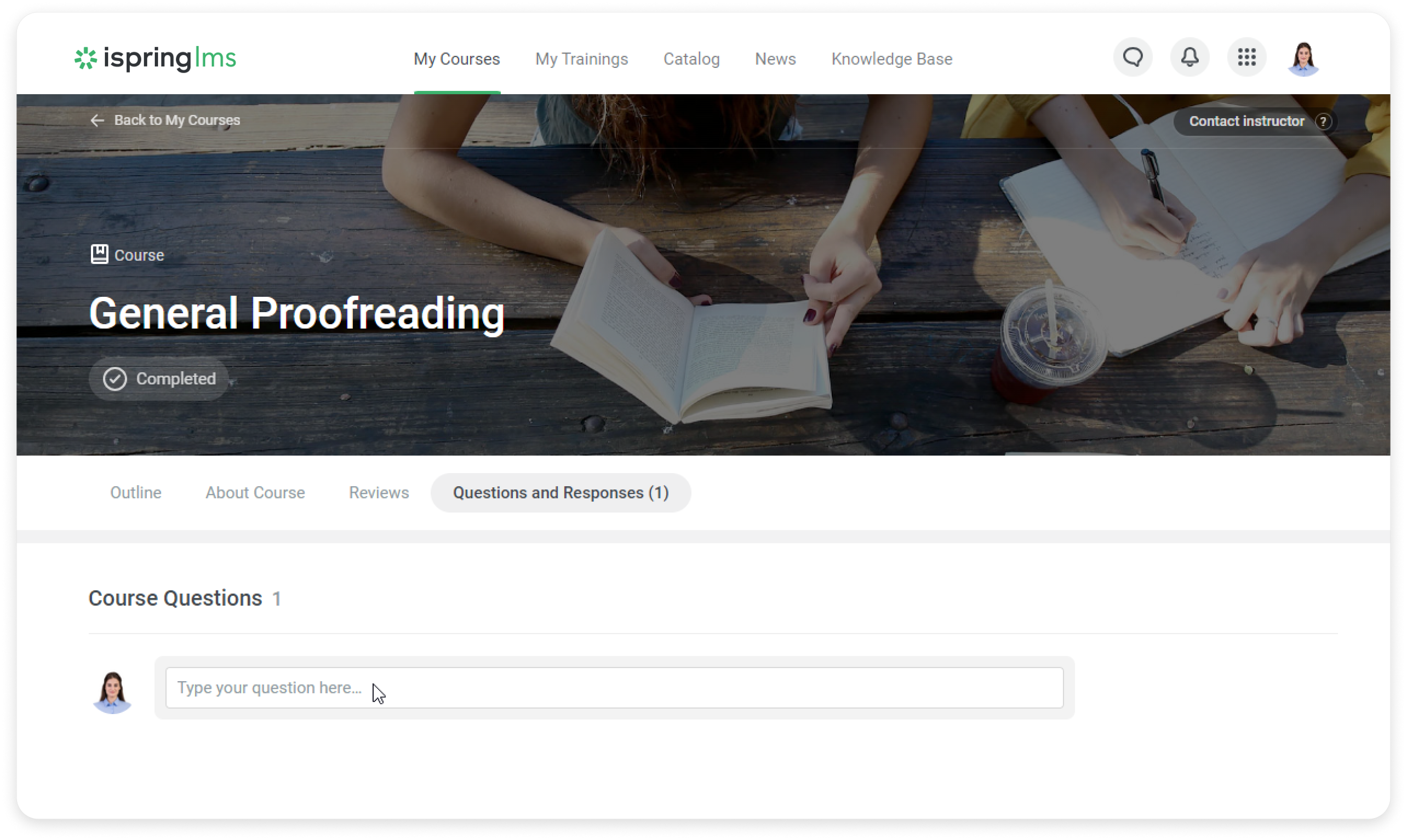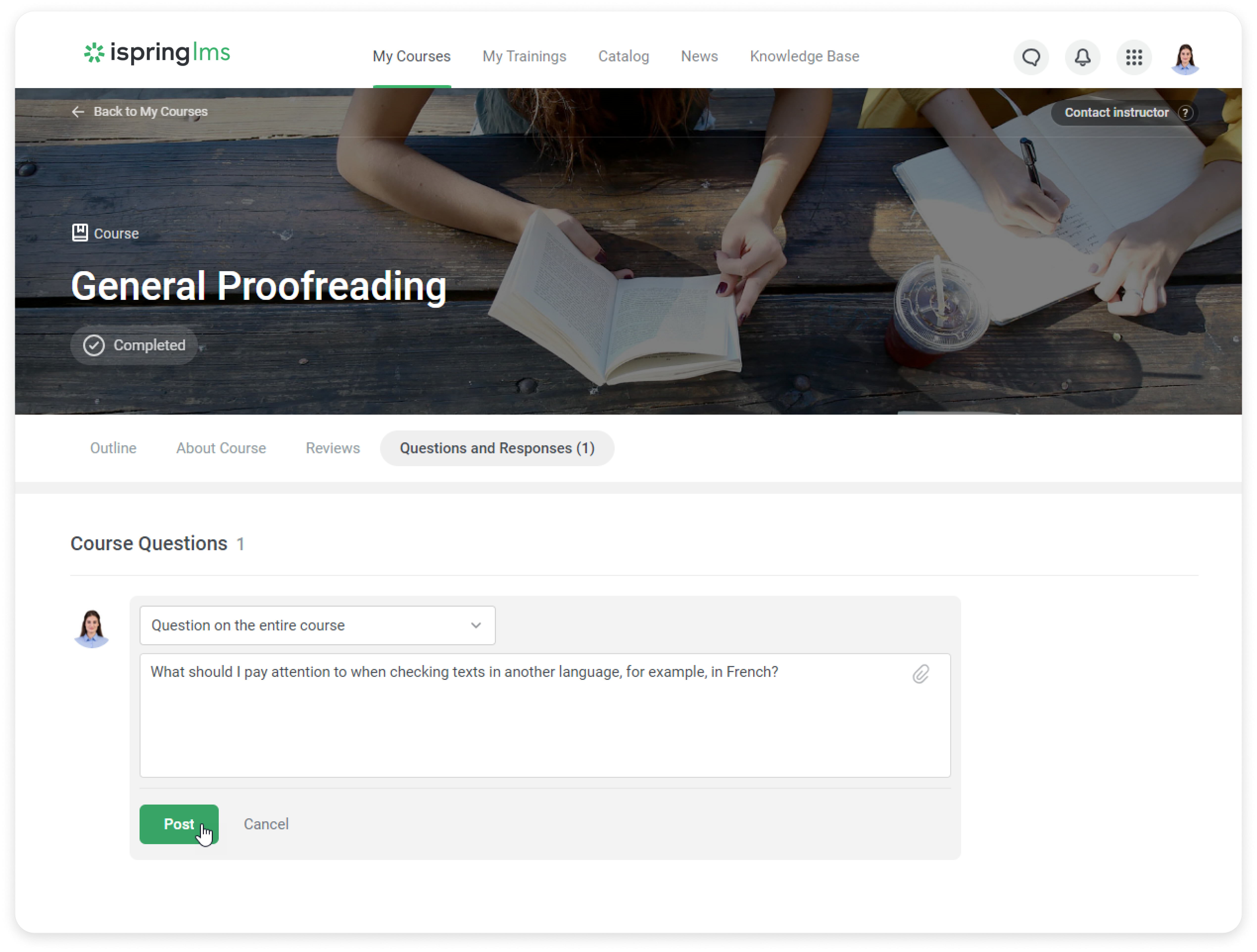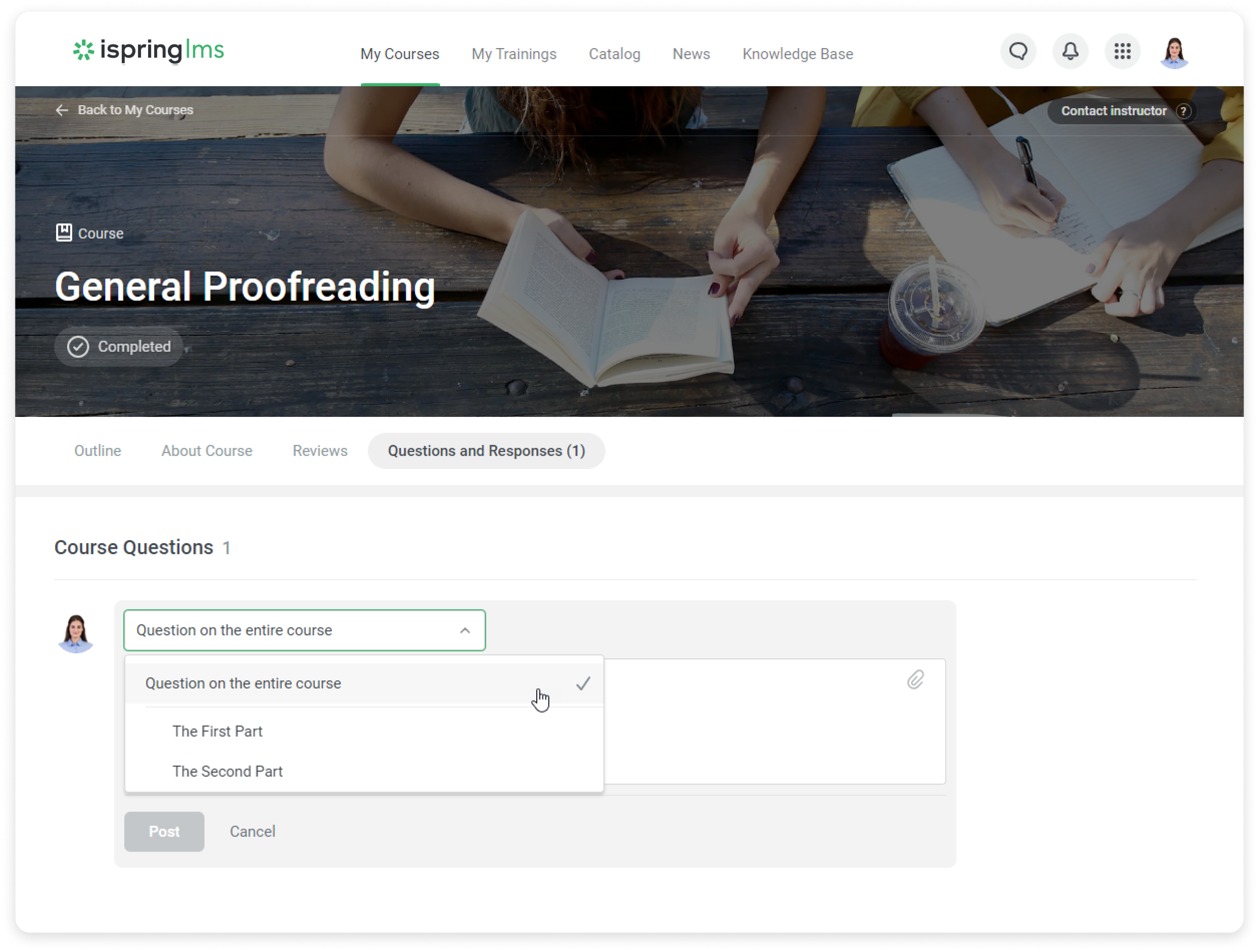 After you have enabled the Questions and Responses feature, users will be able to send their questions about the course or the content items that are included in it.