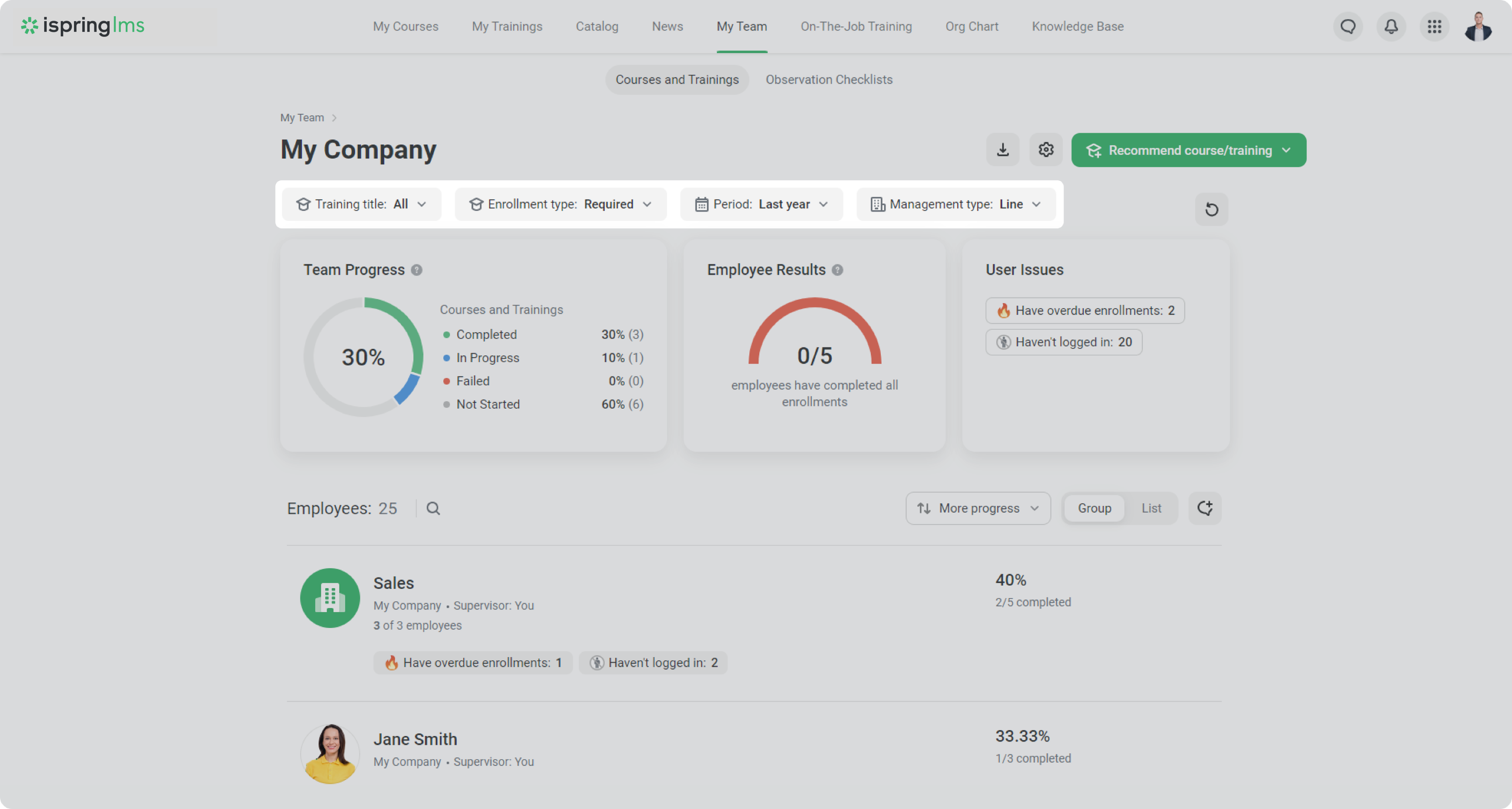 - Enrollment type filters courses assigned by administrators, supervisors, or those which employees chose for themselves.
