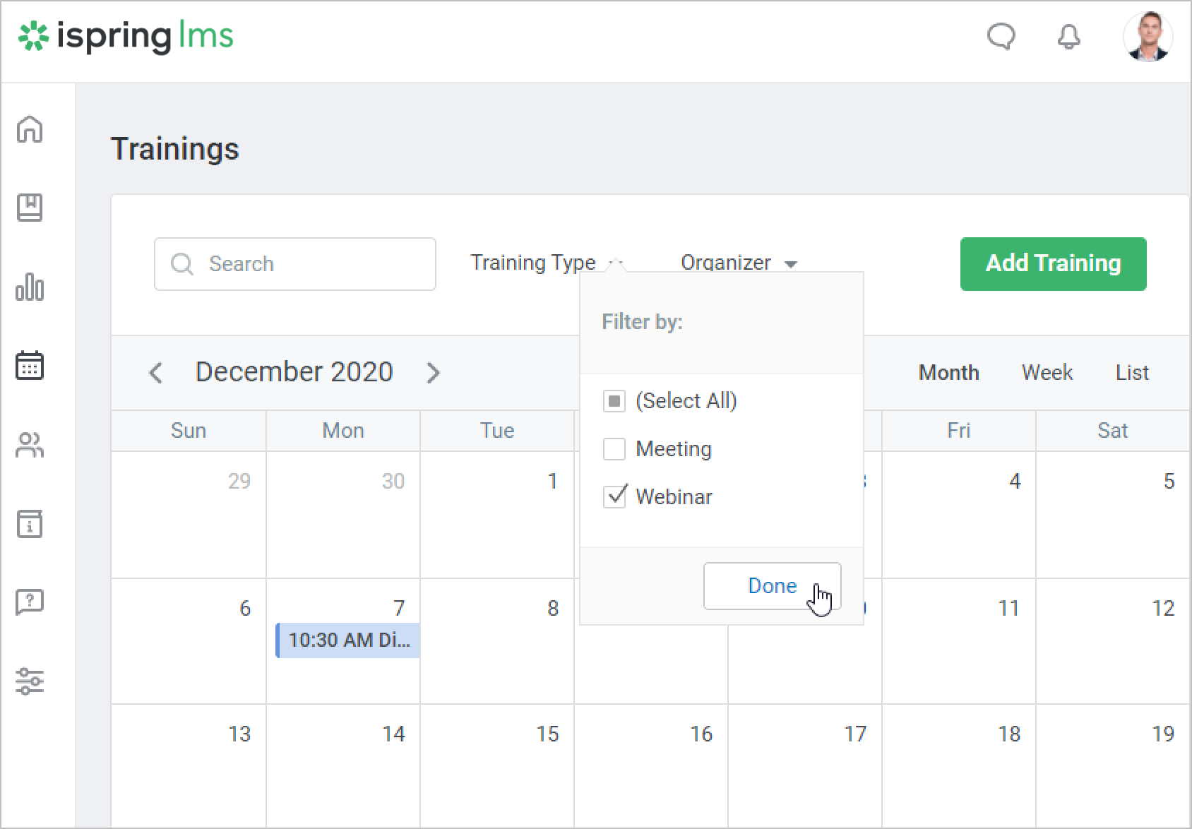 You can choose which events should be shown in the calendar: meetings, webinars, or all trainings. To do this, click the Training Type filter and select the needed type. Next, click Done.