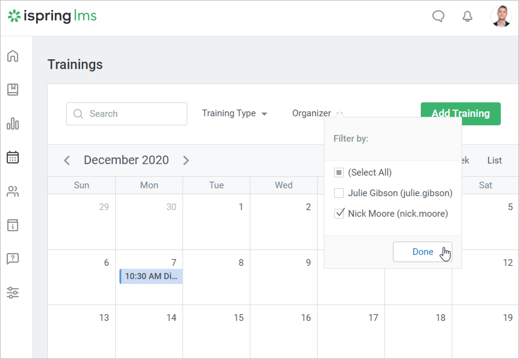 You can filter events according to a particular organizer or multiple organizers. To do this, click the Organizer filter and choose one or more organizers on the menu. To view the trainings of all organizers, check Select All. Then, click Done.