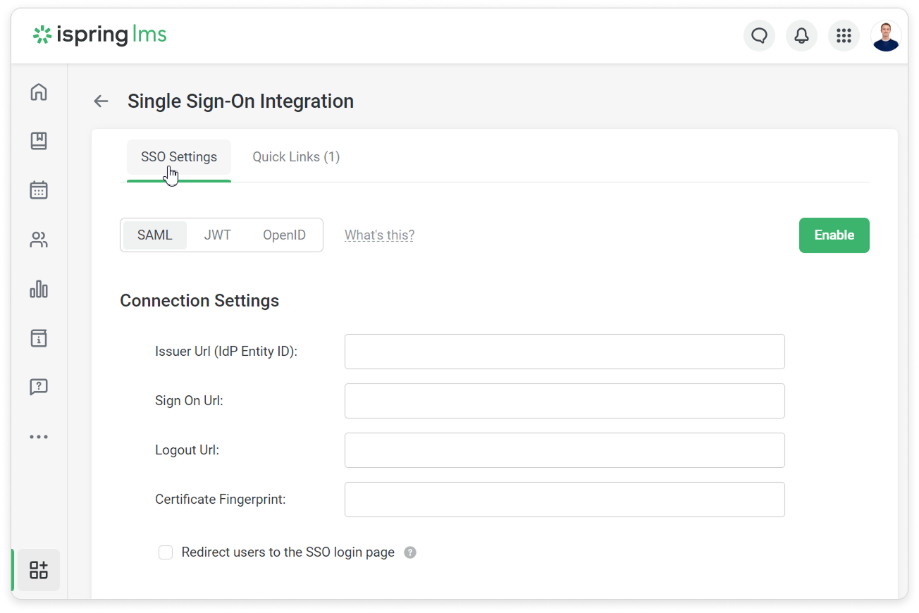 SAML 2.0, JWT and OpenID are single sign-on technologies which allow users to sign in automatically to all company web resources. Your employee or student will need nothing but to log in to their account on a corporate site, their email account or their social media account — and the authorization in iSpring LMS will be completed without entering credentials.