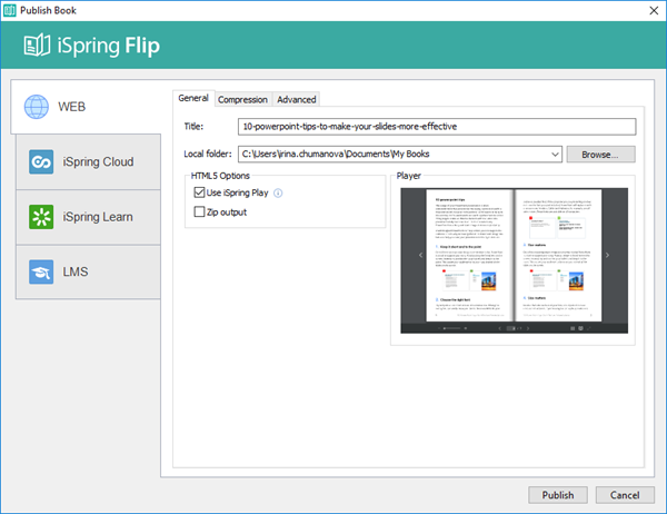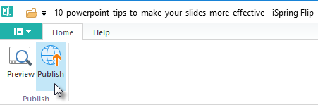 Click on Publish on the iSpring Flip ribbon to open the publishing window and convert your documents or PPTs into an HTML5 book.