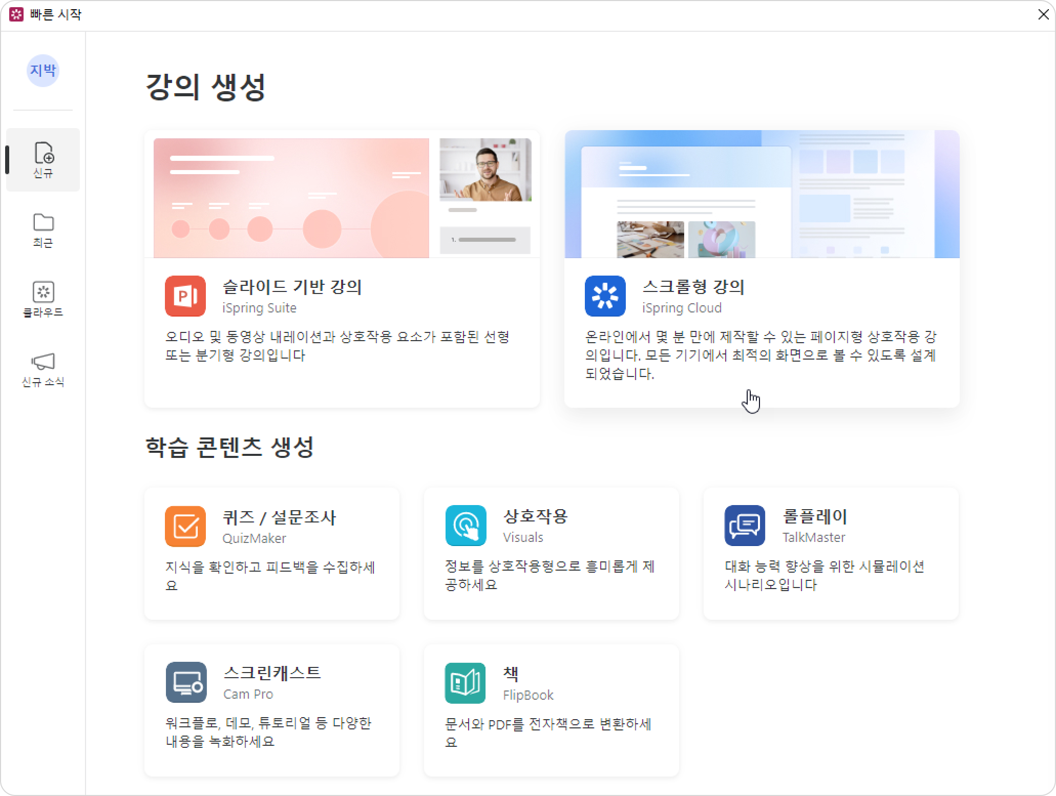 - iSpring Suite를 실행하고 스크롤형 강의를 클릭하거나 iSpring Cloud 계정을 여세요.