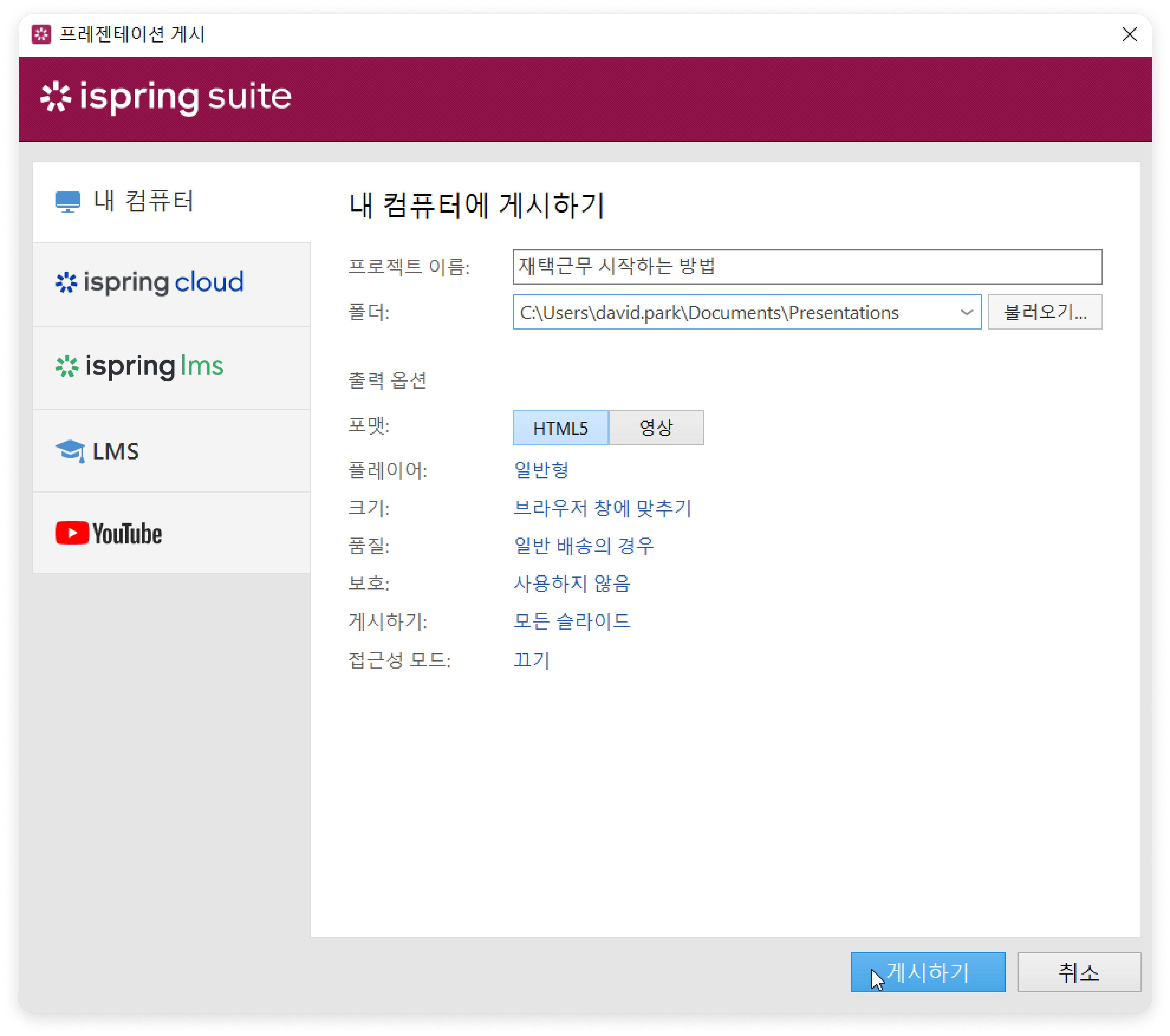 - iSpring Suite의 옵션을 사용하여 강의를 제작하세요.