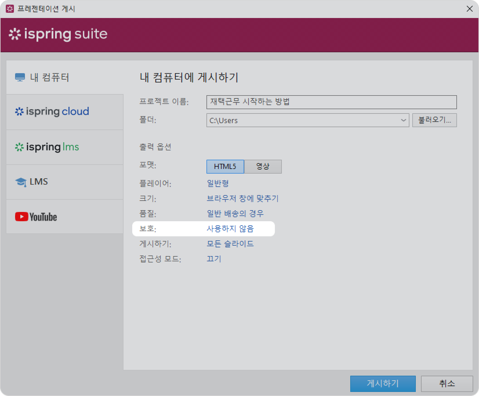 iSpring Suite 강의 게시 게시 옵션 Current: 보호 설정 보호 설정 슬라이드에 워터마크를 추가하거나 비밀번호와 시간 또는 도메인 제한을 사용하여 강의를 무단 사용으로부터 보호할 수 있습니다.보호 설정을 구성하려면 HTML5 형식을 선택하고 보호 필드의 링크를 클릭하세요.워터마크 보호컴퓨터의 이미지를 워터마크로 사용하고 슬라이드에 어떻게 표시되기를 바라는지에 따라 투명도와 위치를 조정할 수 있습니다. 또한 워터마크를 클릭했을 때 열리는 웹 페이지의 링크를 지정할 수도 있습니다.워터마크 추가를 선택하고 컴퓨터에서 이미지를 찾으세요.슬라이드 내 워터마크의 위치를 선택하세요.워터마크의 투명도를 0%(불투명)에서 100%(투명) 사이로 설정하세요.마우스 클릭 시 다음 웹 페이지 열기를 선택하고 워터마크를 클릭했을 때 실행될 페이지의 주소를 입력하세요.새 브라우저 창에서 웹 페이지를 열려면 새 브라우저 창에서 링크 열기를 선택하세요.마지막으로 저장을 클릭하세요.비밀번호 보호비밀번호는 다른 사람들이 강의를 무단으로 보는 것을 방지합니다. 강의를 보려면 사용자는 비밀번호를 입력해야 합니다.비밀번호로 프레젠테이션 보호 옵션을 선택하세요.비밀번호와 비밀번호 확인 필드에 비밀번호를 입력하세요.마지막으로 저장을 클릭하세요. 비밀번호는 암호화된 형태로 강의에 저장됩니다. 비밀번호를 잊어버리면 복구할 수 없습니다. 시간 제한사용자가 강의를 볼 수 있는 날짜를 지정할 수 있습니다. 날짜 지정 시 슬라이드는 지정된 시간 간격(날짜 전, 날짜 후, 날짜 사이)에만 볼 수 있습니다.시간 제한을 추가하려면 다음 단계를 따르세요.다음 날짜 이후에 표시 및/또는 다음 날짜까지 표시를 선택하세요.표시되는 달력에서 날짜를 선택하세요.두 필드의 날짜를 모두 지정하면 프레젠테이션을 볼 수 있는 기간을 제한할 수 있습니다.마지막으로 저장을 클릭하세요.도메인 제한사용자가 특정 도메인과 하위 도메인에서만 강의를 볼 수 있도록 허용할 수 있습니다. 이 옵션은 콘텐츠를 허가받지 않은 배포로부터 보호하는 데 효과적입니다.다음 도메인에서만 재생 허용 옵션을 활성화하세요.강의를 볼 수 있는 도메인을 추가하세요. 구분 기호로 세미콜론을 사용하세요.마지막으로 저장을 클릭하세요. HTML <object> 태그를 사용하여 웹 페이지에 강의를 삽입하는 경우, 이 옵션은 재생을 제한하지 않습니다. ×