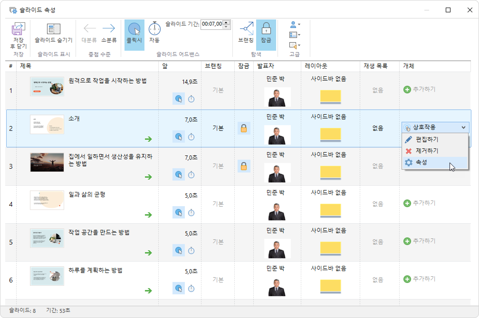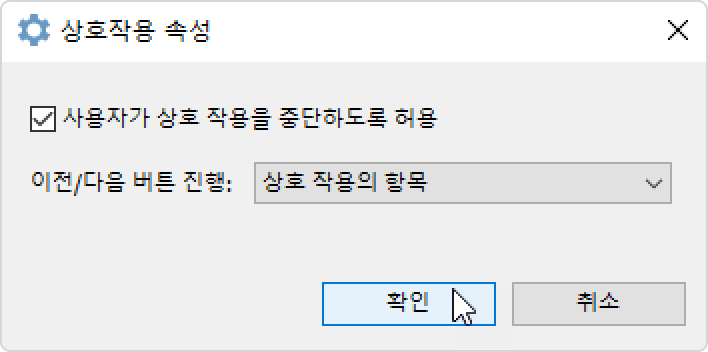 iSpring Suite 프레젠테이션 관리 슬라이드 속성 슬라이드에 자료 추가 Current: 상호작용 설정 상호작용 설정 상호작용 완료 설정을 구성하세요.사용자가 상호작용을 중단하도록 허용상호작용 항목 또는 프레젠테이션 슬라이드 중 이전/다음 버튼을 클릭했을 때 변경될 요소 선택상호작용 매개변수를 구성하려면 다음 단계를 따르세요.iSpring Suite 툴바에서 슬라이드 속성 버튼을 클릭하세요.상호작용 슬라이드를 선택하고 상호작용 메뉴를 열고 속성을 선택하세요.상호작용을 구성하고 확인을 클릭하세요.상호작용 속성사용자가 상호 작용을 중단하도록 허용이 옵션이 활성화되어 있으면 사용자는 언제든지 상호작용을 중단하고 계속해서 프레젠테이션의 다른 슬라이드를 볼 수 있습니다.이 옵션이 비활성화되어 있으면 사용자는 상호작용을 완료한 후에만 돌아와서 프레젠테이션의 다른 슬라이드를 볼 수 있습니다.이전/다음 버튼 진행상호작용 항목 또는 프레젠테이션 슬라이드 중 이전/다음 버튼을 클릭했을 때 변경될 요소를 선택하세요.툴바에서 저장 후 닫기를 클릭하세요. ×