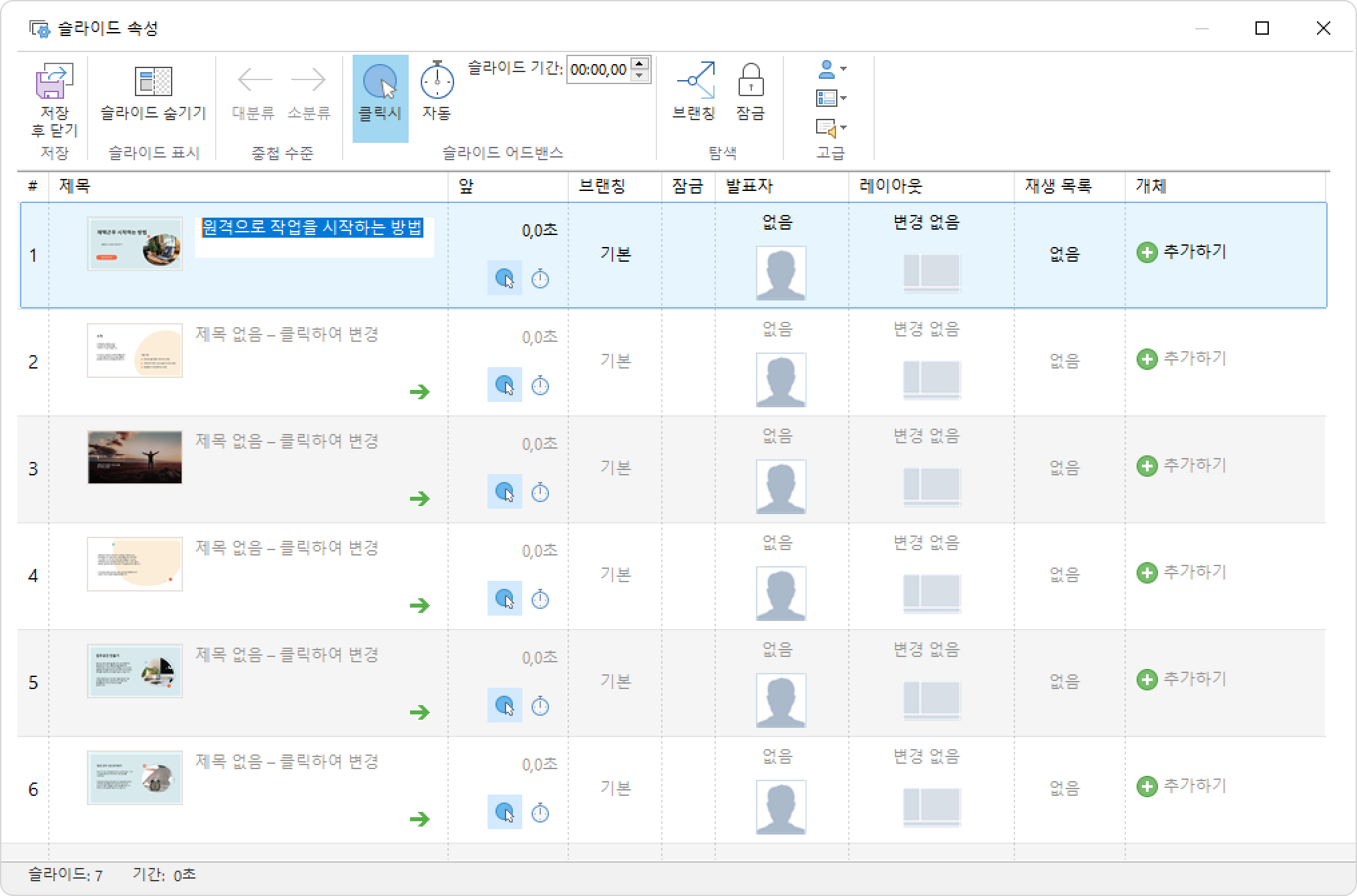 - 제목을 편집하고자 하는 슬라이드를 선택하세요. 그런 다음 슬라이드를 더블 클릭하거나 키보드에서 F2를 누르세요.