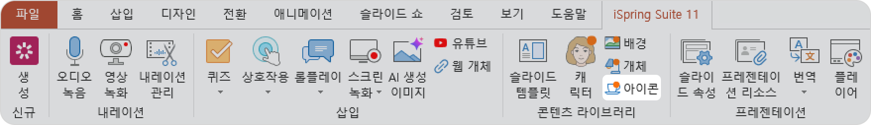 콘텐츠 라이브러리에 있는 아이콘과 컨트롤을 강의에 추가할 수 있습니다.