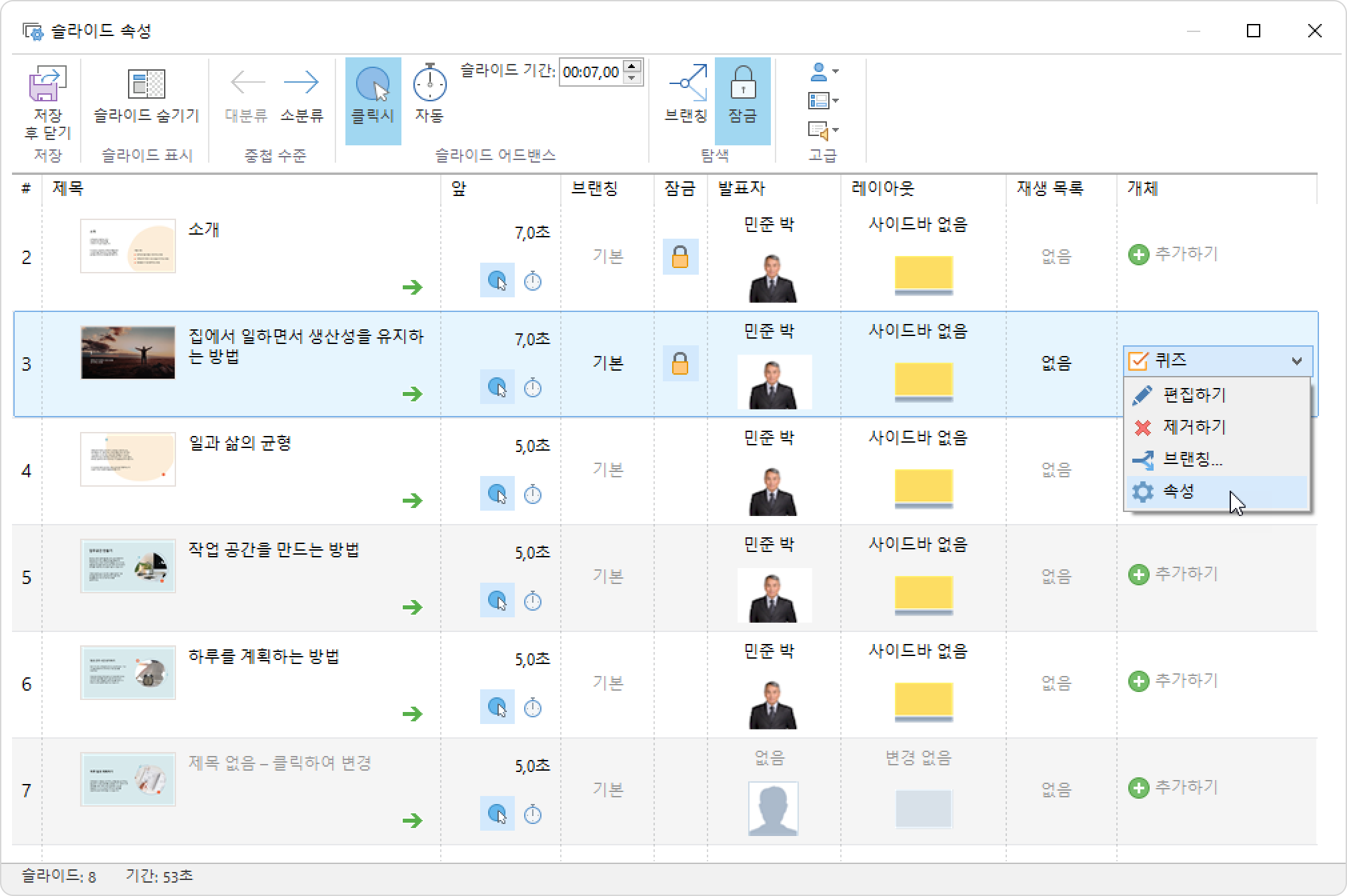 - 퀴즈 슬라이드를 선택하고 퀴즈 메뉴를 열고 속성을 선택하세요.