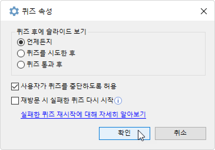 - 학습자가 퀴즈 슬라이드를 다시 열면 불합격한 퀴즈의 처음부터 다시 시작