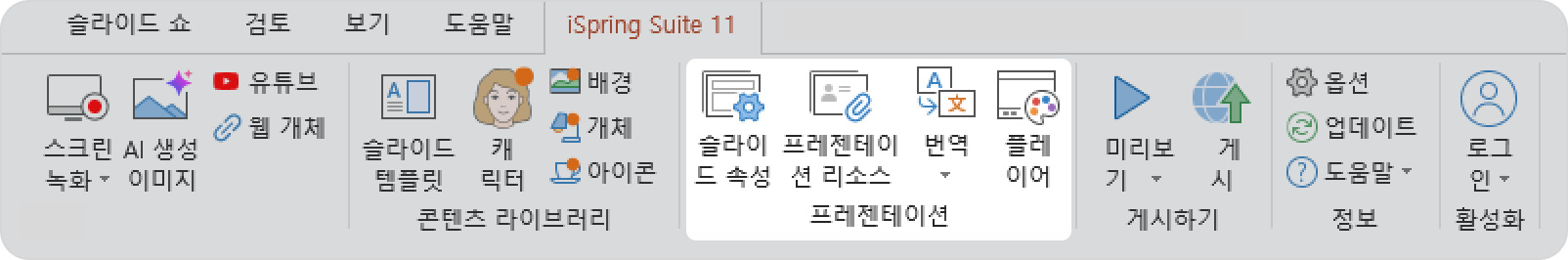 iSpring Suite Current: 프레젠테이션 관리 프레젠테이션 관리 iSpring Suite 11 탭에는 프레젠테이션의 구조와 추가 리소스를 관리할 수 있는 프레젠테이션 섹션이 있습니다. 프레젠테이션 관리는 다음 세 가지 도구로 할 수 있습니다.슬라이드 속성: 프레젠테이션 구조 구성, 슬라이드 고급 옵션 및 탐색 제한 설정, 발표자 추가프레젠테이션 리소스: 프레젠테이션의 참조, 첨부파일 및 외부 리소스 링크 관리플레이어: 플레이어 디자인 및 재생 설정 조정 ×