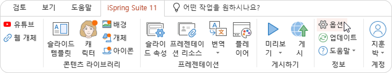 iSpring Suite Current: 프록시 서버 구성 프록시 서버 구성 기본적으로 프록시 서버 설정은 자동으로 감지되지만 수동으로 구성할 수도 있습니다. iSpring Suite 앱은 기본 인증 방법을 사용하는 경우에만 프록시 서버를 통해 작동합니다. 옵션을 클릭하세요.옵션 창이 열립니다. 프록시 서버 섹션에서 사용자 정의를 클릭하세요.설정 자동 탐지 확인란을 선택 취소하세요.그런 다음 프록시 서버 설정을 입력하고 확인을 클릭하세요.마지막으로 업데이트된 iSpring Suite 설정을 저장하세요.그럼 됐습니다! 설정이 수동으로 구성됐습니다. ×