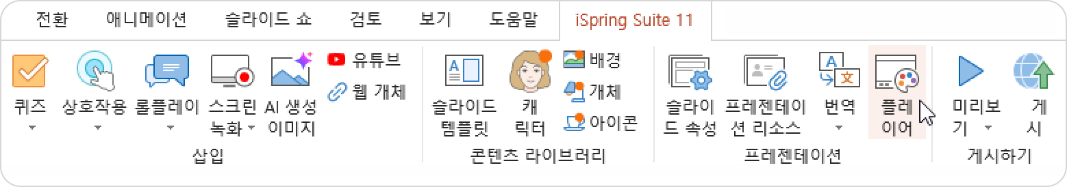 iSpring Suite Current: 플레이어 사용자 지정 플레이어 사용자 지정 iSpring Suite 11을 사용하면 프레젠테이션 중에 슬라이드가 표시되는 방식과 관련하여 3가지 방법 중에서 선택할 수 있습니다.적응형 일반형 플레이어: 모든 기기에서 모든 유형의 콘텐츠와 완벽하게 작동합니다.강의 영상 플레이어: 필요할 때마다 강의 자료나 강사에게 사용자의 주의를 집중시켜 줍니다.플레이어 없음(슬라이드만 해당): 강의 슬라이드만 표시됩니다.플레이어 유형을 선택하려면 다음 단계를 따르세요.iSpring Suite 11 툴바에서 플레이어 버튼을 클릭하세요.플레이어 선택 메뉴에서 플레이어 유형을 선택하세요.변경 사항을 저장하려면 닫기 후 적용를 클릭하세요. ×