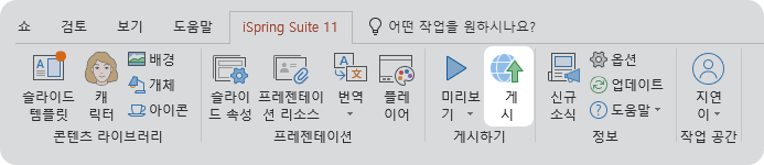 - 파워포인트를 열고 iSpring Suite 11 탭을 선택하세요. 그런 다음 게시를 클릭하세요.