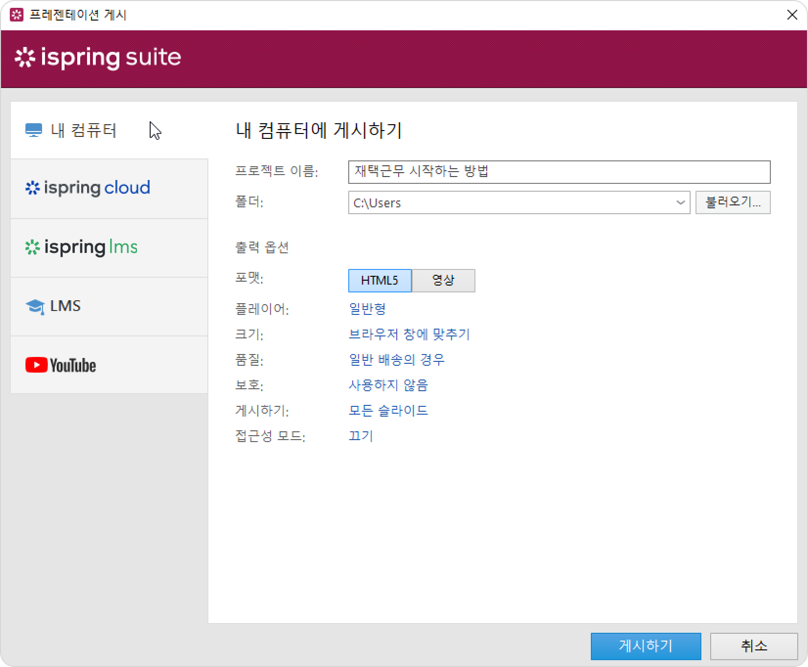 - 내 컴퓨터 탭을 선택하고 강의 이름을 입력한 다음 설정을 구성하세요. 마지막으로 게시하기를 클릭하세요.