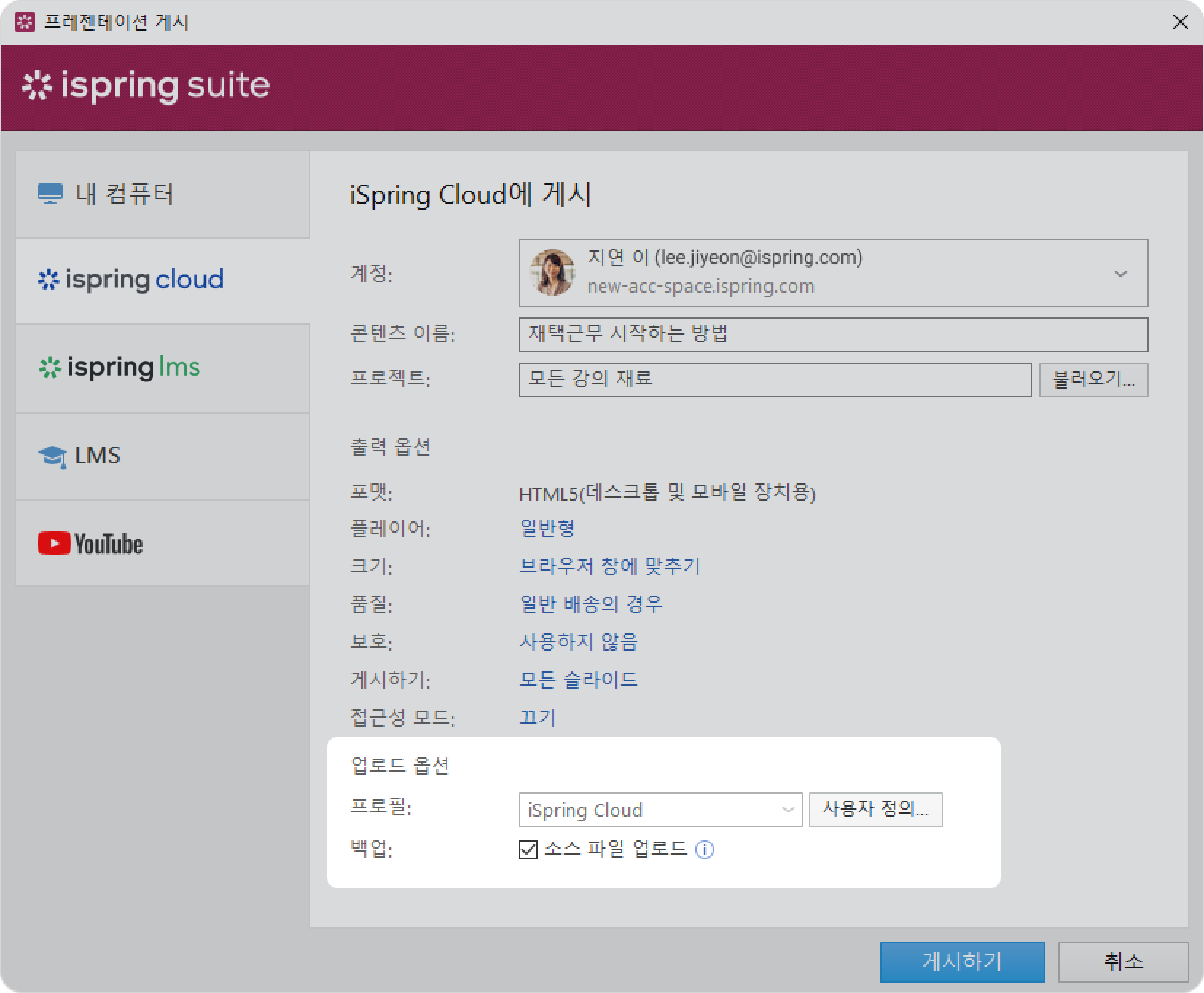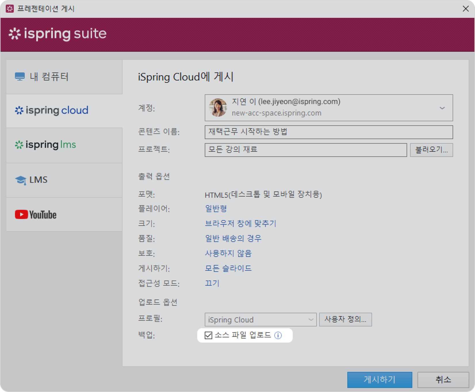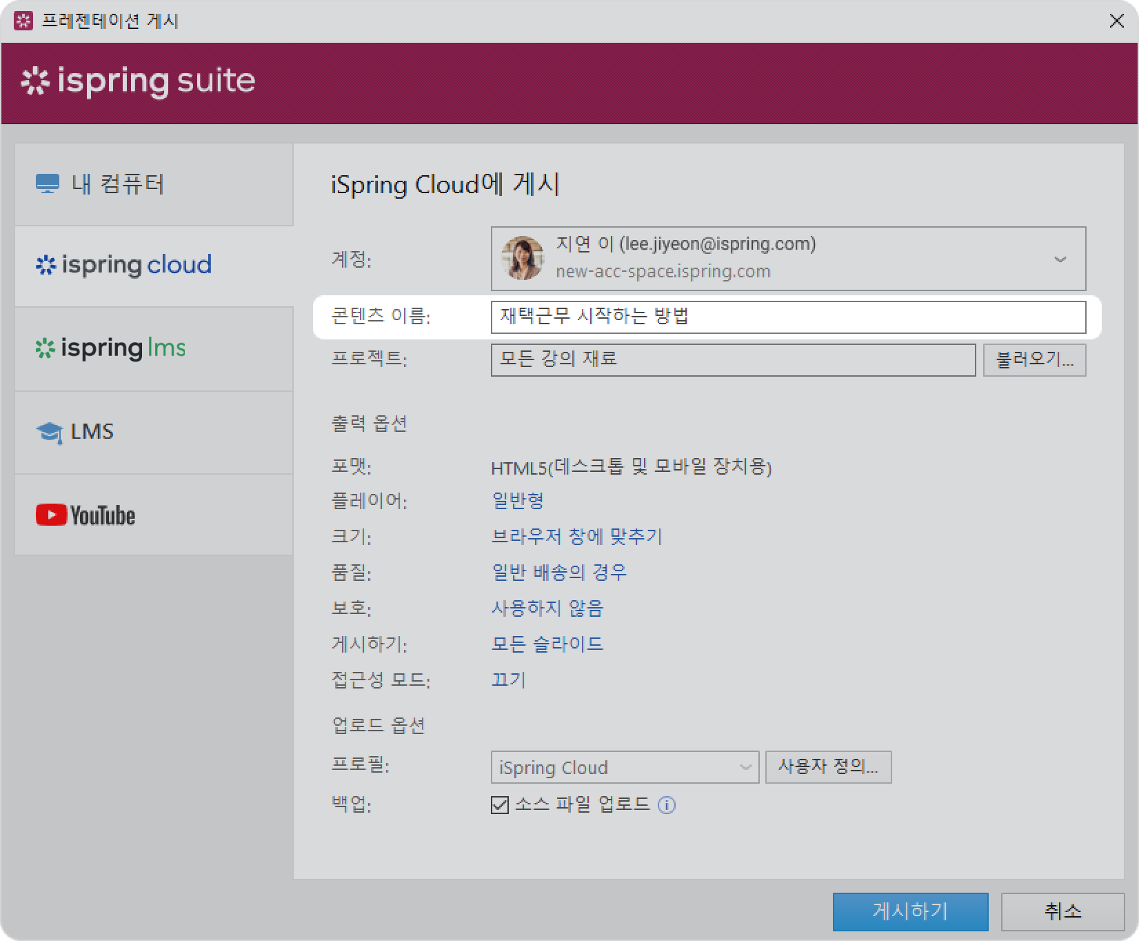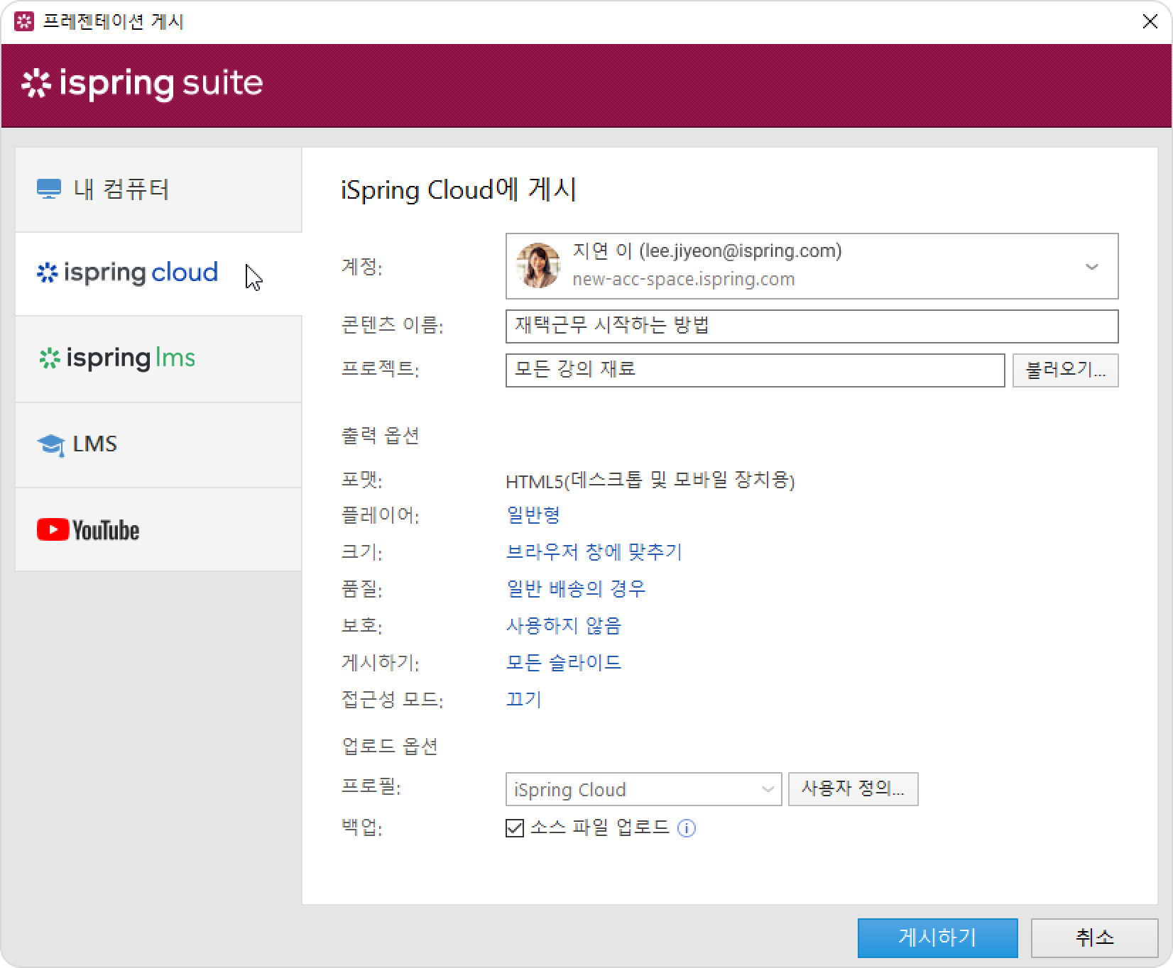 iSpring Suite 강의 게시 게시 대상 Current: iSpring Cloud에 게시 iSpring Cloud에 게시 강의 편집을 마친 후에는 강의 생성 및 콘텐츠 저장 플랫폼인 iSpring Cloud에 업로드하세요.바이러스 백신 프로그램이나 프록시 서버 오류로 인해 온라인 게시가 완료되지 않거나 컴퓨터의 인터넷 연결이 끊긴 경우 iSpring Cloud에 콘텐츠를 수동으로 업로드하는 방법을 알아보세요.프레젠테이션을 iSpring Cloud에 게시하려면 다음 단계를 따르세요.iSpring Suite 11 툴바에서 게시 버튼을 클릭하세요.iSpring Cloud 탭을 선택하세요. iSpring Cloud 계정에 이미 로그인한 경우 프로필 데이터가 계정 필드에 입력되므로 다시 입력할 필요가 없습니다.아직 iSpring Cloud 계정에 로그인하지 않았다면 지금 로그인하세요. iSpring Cloud를 사용하여 iSpring Suite AI 라이선스를 활성화할 때와 동일한 지침을 따르세요.콘텐츠 이름 입력란에 강의 제목을 입력하세요. 기본적으로 제목은 파워포인트 프레젠테이션의 제목과 동일합니다.프로젝트 필드 오른쪽에 있는 불러오기...를 클릭하고 콘텐츠를 업로드할 폴더를 선택한 다음 선택을 클릭하세요. 기본적으로 강의는 일반 콘텐츠 목록에 업로드됩니다. 참고:게시 당시 저작자는 자신의 프로젝트나 iSpring Cloud의 기존 프로젝트에 액세스할 수 없는 경우가 있습니다. 이 경우 저작자의 강의는 새로 생성된 프로젝트에 게시됩니다.프로젝트 제목은 Dan Green과 같이 저작자의 이름과 성으로 저장됩니다. 저작자의 이름과 성이 프로필에 입력되어 있지 않은 경우 프로젝트 제목은 dan.green과 같이 저작자의 로그인 ID로 저장됩니다.해당 프로젝트에 대한 팀 액세스는 기본적으로 비활성화되어 있습니다. 즉, 저작자와 계정 소유자만 해당 프로젝트 자료에 액세스할 수 있습니다. 다른 참가자가 프로젝트에 참여하도록 허용하려면 팀 액세스를 활성화하거나 특정 팀원에게 액세스 권한을 부여하세요.강의를 게시하려는 프로젝트를 편집할 수 있는 권한이 있는지 확인하세요. 보기만 가능하거나 프로젝트에 대한 액세스 권한이 없으면 게시가 완료되지 않습니다.강의 크기가 2GB를 초과하지 않는지 확인하세요. 그런 다음 출력 옵션을 설정하세요.플레이어 유형을 선택하거나 이전에 선택한 플레이어를 사용자 정의하세요.강의가 브라우저에서 작동하는 방식을 지정하세요.이미지, 오디오, 동영상 파일의 품질 수준을 선택하세요.강의에 대한 보호 설정을 구성하세요.게시할 슬라이드를 선택하세요(모두 또는 선택한 슬라이드만).액세스 가능 모드로 프레젠테이션을 게시하세요.다음으로 업로드 옵션을 지정하세요.iSpring Cloud가 기본으로 선택된 프로필 메뉴 옆의 사용자 정의 버튼을 클릭하세요.열린 창에서, 태그, 설명 및 강의 저작자를 추가하고 진행 및 완료 매개변수를 설정하세요.iSpring Cloud에 강의 배포 파일을 저장하려면 백업 필드에서 소스 파일 업로드를 선택하세요. 공동작업을 가능하게 하거나 백업을 생성하려면 이 옵션을 선택하세요.게시하기 버튼을 클릭하세요.이제 강의가 iSpring Cloud에 업로드되었습니다. iSpring Cloud 인터페이스에서 교육 자료를 보려면 콘텐츠 관리를 클릭하세요.iSpring Cloud 계정이 브라우저에서 열립니다. 업로드된 강의는 강의가 속한 프로젝트에서 볼 수 있습니다. 참고:프로젝트에 동일한 제목을 가진 교육 자료가 이미 업로드되어있다면 제목을 변경하거나 기존 강의를 새 강의로 바꾸세요. ×