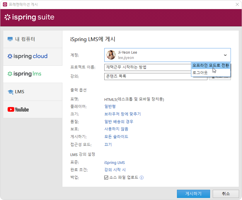 iSpring LMS에 소스 콘텐츠 파일을 저장하려면 러닝 강의 옵션 섹션에서 소스 파일 업로드를 선택하세요. 이렇게 하면 팀과 함께 프로젝트를 작업하거나 항목의 백업 복사본을 클라우드에 저장할 수 있습니다.