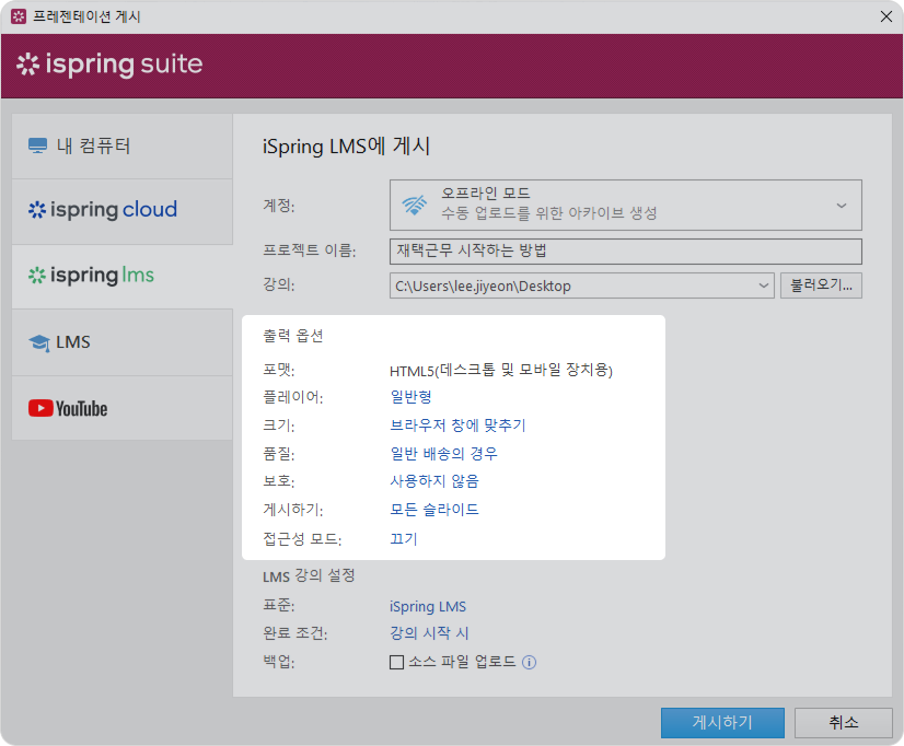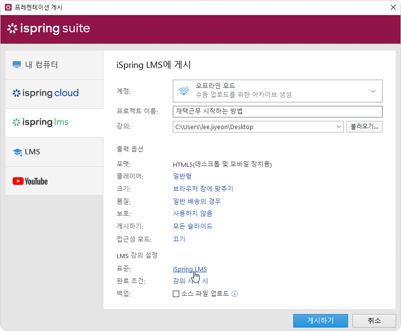 iSpring Suite에서 생성된 iSpring LMS 업로드용 패키지가 보일 것입니다. 이제 iSpring LMS 계정에 로그인하여 언제든지 이 패키지를 강의에 업로드할 수 있습니다. 자세한 내용은 웹 인터페이스를 통해 콘텐츠를 업로드하는 방법에 대한 자세한 지침을 읽어보세요.