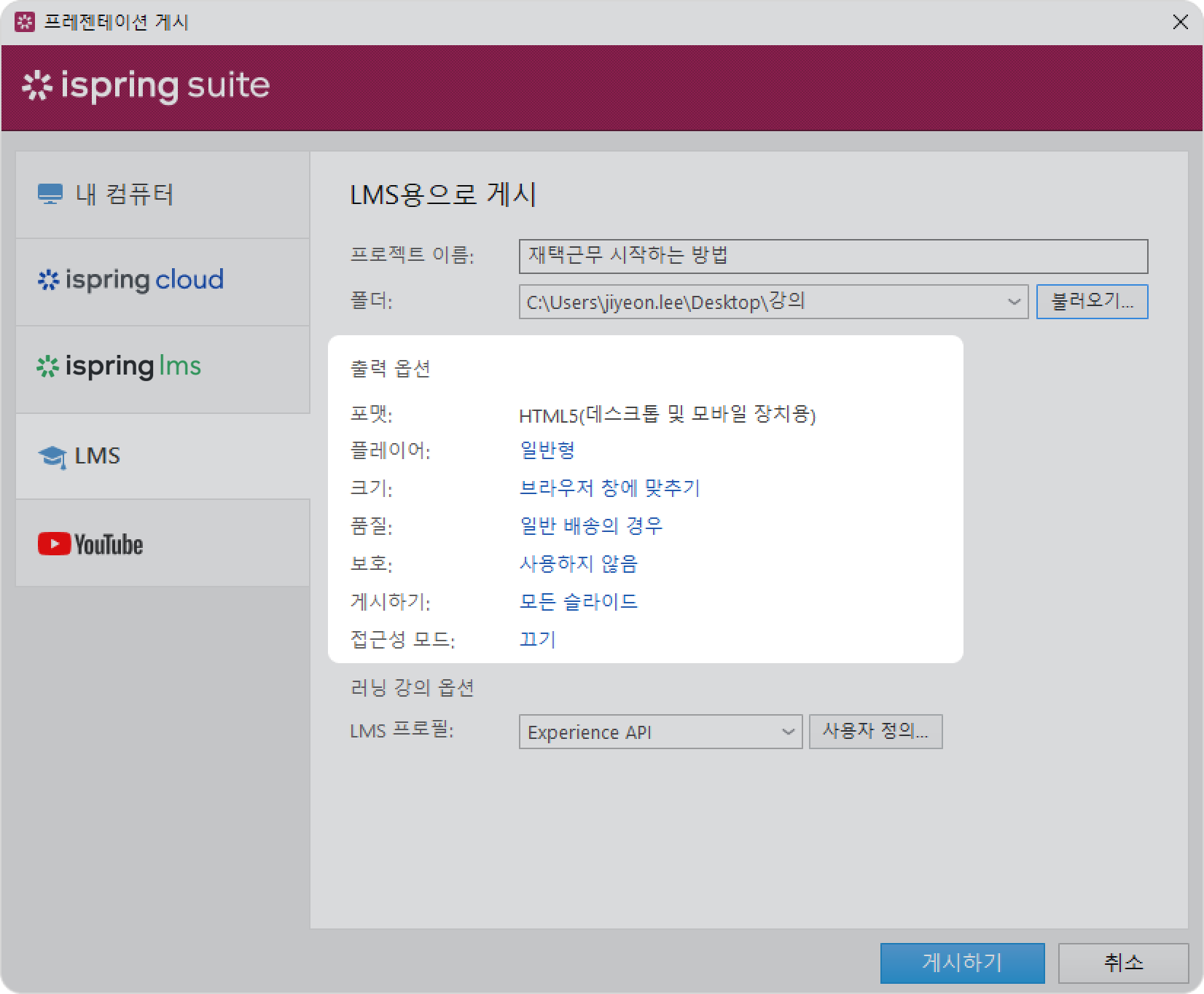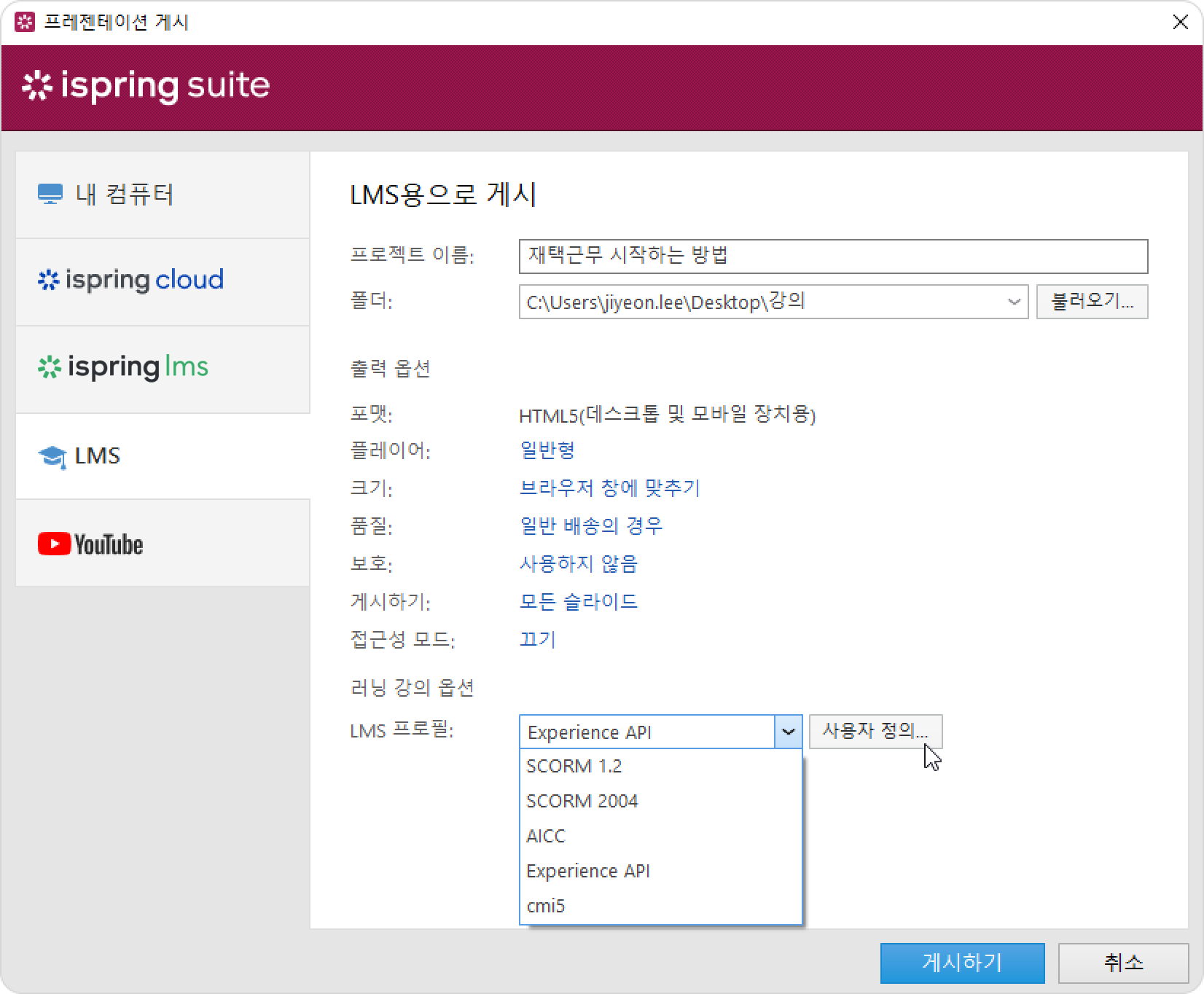 iSpring Suite 강의 게시 게시 대상 Current: LMS에 게시 LMS에 게시 LMS 옵션을 사용하면 모든 학습 관리 시스템에 업로드할 수 있는 패키지를 만들 수 있습니다. LMS에 업로드할 수 있는 패키지를 만들려면 해당 LMS가 지원하는 표준(SCORM 1.2, SCORM 2004, AICC, Experience API(Tin Can) 또는 cmi5)을 선택하고 강의를 게시하세요. 온라인 강의를 테스트하고 조정하려면 SCORM Cloud 서비스를 사용하세요.SCORM Cloud를 사용하면 SCORM, AICC, xAPI 또는 cmi5 강의가 LMS에서 어떻게 작동하고 어떤 결과를 낼 지 확인할 수 있습니다.콘텐츠 크기가 100MB 이하이고 등록된 학습자 수가 10명을 초과하지 않는 경우 SCORM Cloud 서비스는 무료입니다. iSpring Suite 11 툴바에서 게시 버튼을 클릭하세요.프레젠테이션 게시 창에서 LMS 탭을 선택하세요.폴더 필드에서 강의를 저장할 로컬 또는 네트워크 폴더를 지정하세요. 폴더를 지정하려면 오른쪽에 있는 불러오기... 버튼을 클릭하고 원하는 폴더를 선택한 다음 폴더 선택을 클릭하세요.그런 다음 출력 옵션을 설정하세요.플레이어 유형을 선택하거나 이전에 선택한 플레이어를 사용자 정의하세요.강의가 브라우저에서 작동하는 방식을 지정하세요.이미지, 오디오, 동영상 파일의 품질 수준을 선택하세요.강의에 대한 보호 설정을 구성하세요.게시할 슬라이드를 선택하세요(모두 또는 선택한 슬라이드만).액세스 가능 모드로 프레젠테이션을 게시하세요.LMS 프로필 필드에서 LMS가 지원하는 표준을 선택하세요.SCORM 1.2SCORM 2004AICCExperience API(일명 Tin Can)cmi5각 표준에 대한 설정을 변경하려면 오른쪽에 있는 사용자 정의 버튼을 클릭하세요. 설정에 대한 자세한 내용은 LMS 프로필 설정 글에 설명되어 있습니다.강의를 게시하려면 게시하기 버튼을 클릭하세요.게시가 완료된 후 열리는 창에서 다음 작업을 수행할 수 있습니다.브라우저에서 프레젠테이션 보기컴퓨터에서 강의 폴더 열기프레젠테이션을 이메일 첨부 파일로 보내기FTP 서버에 자료 업로드 ×