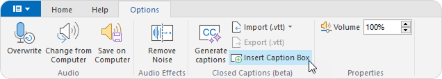 - Click on the audio or video track so the Insert Caption Box option will become clickable on the toolbar. Then click on it.