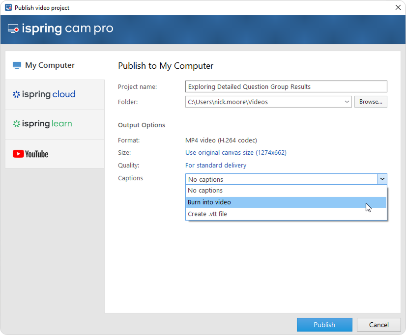 - Burn into video: this way, the captions will be burned into the video, and you will not be able to turn them off.