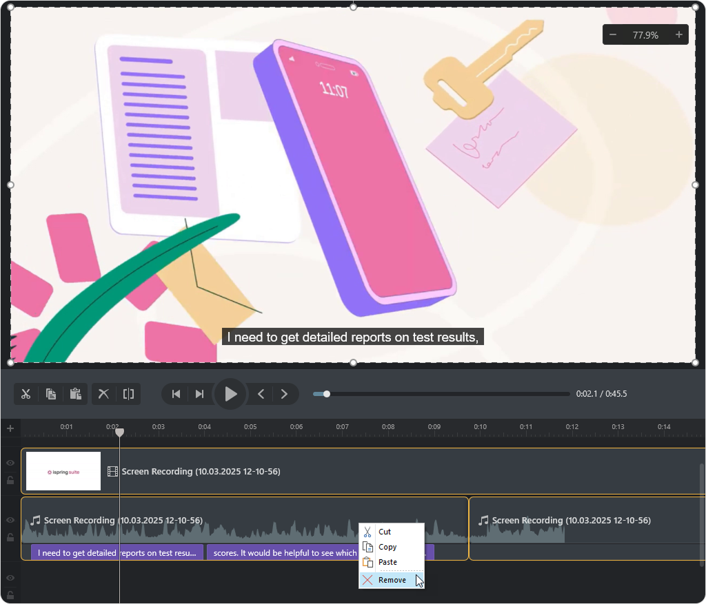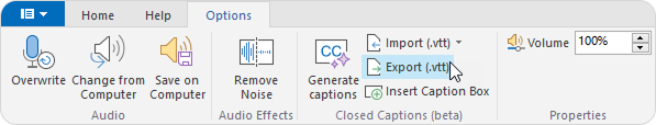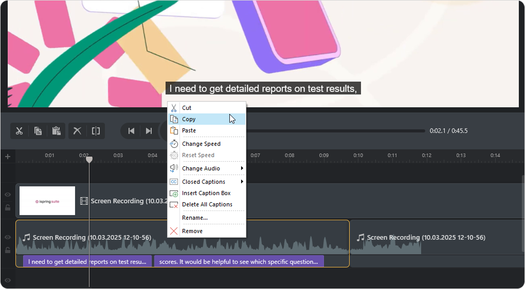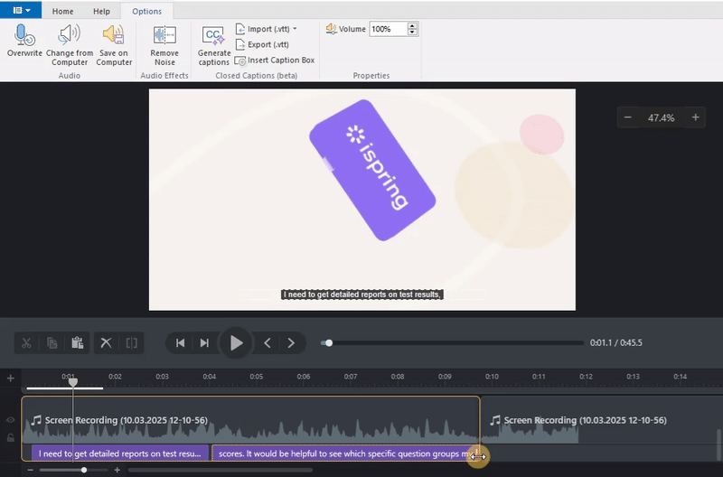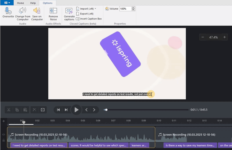 iSpring Cam Pro Closed Captions Current: Managing Captions Managing Captions You can easily manage your captions with a few simple steps. Here's how you can do it:Edit the caption’s text: Click on the caption’s text and make your changes.Change the caption’s duration: Drag the borders of the text block under the video or audio track. If you shorten the clip, captions will only be generated for the visible part of the selected clip. Move captions: Drag the caption block to the desired position on the track.Split captions: Select the caption and click on the Split option.Remove captions: select the audio or video, then right-click and choose Remove, or simply press the Delete key.Copy and paste captions: Select the audio or video, right-click and choose Copy, then Paste. Note that any changes made to the original caption will not affect its copy. Export captions: Click on Export (.vtt) on the toolbar and choose where to save the captions. The exported file will have a .vtt extension. ×