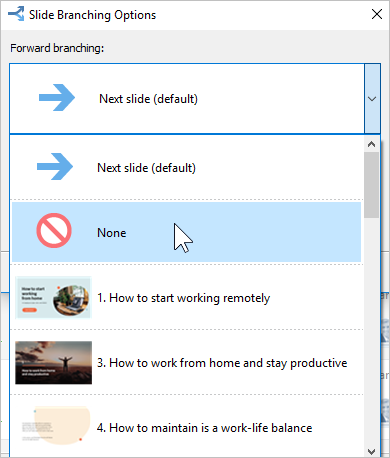 Note: The default branching parameters are: the next slide for advancing forward and the previous slide for moving backwards.