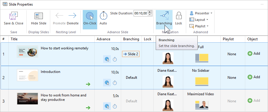 Next, click the Branching button on the toolbar and select the branching option. This method will work if you have selected one or more slides. The second way to choose a slide to advance is to click on the Branching column next to the slide’s thumbnail. This method will work if you selected only one slide.