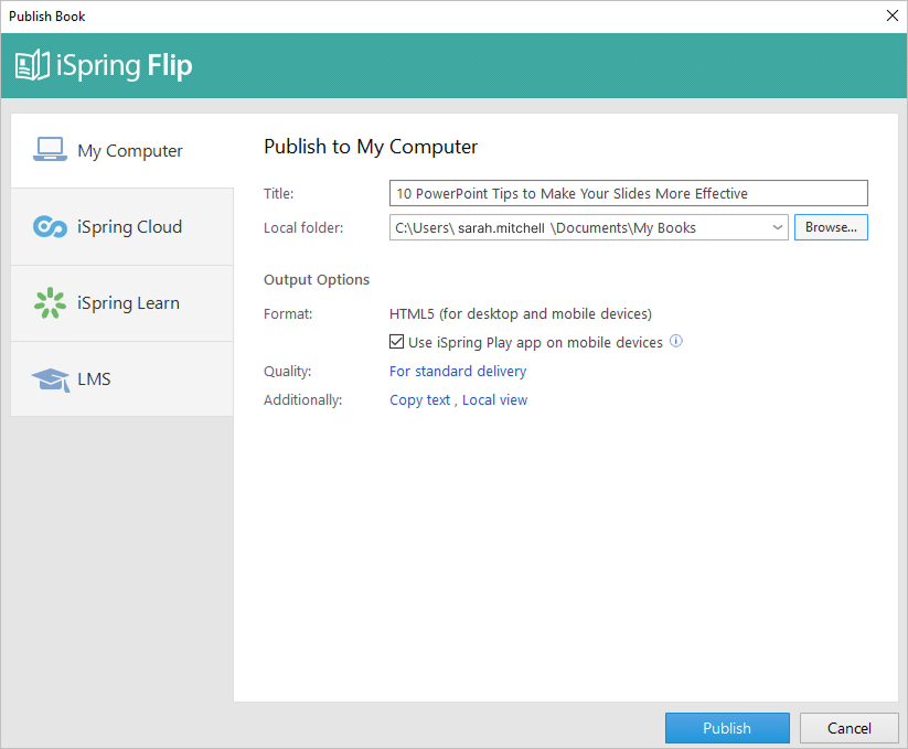Click on Publish on the iSpring Flip ribbon to open the publishing window and convert your documents or PPTs into an HTML5 book.